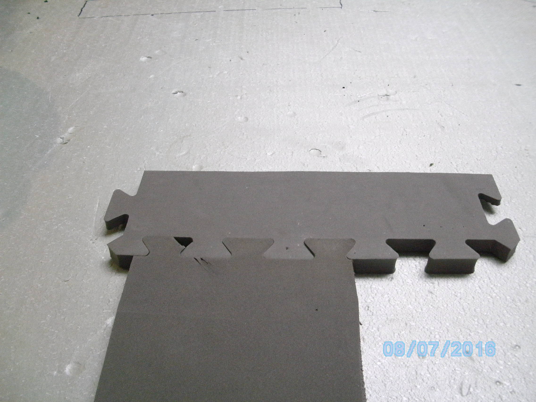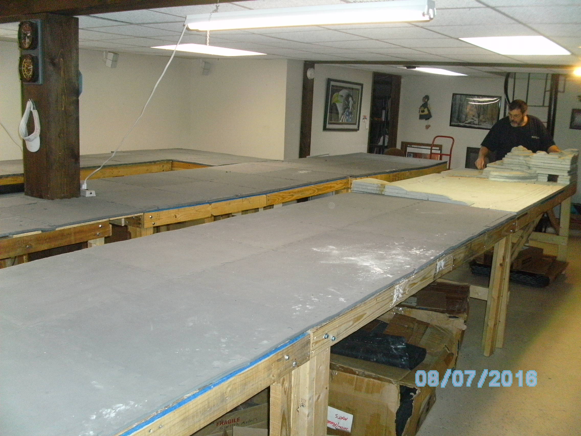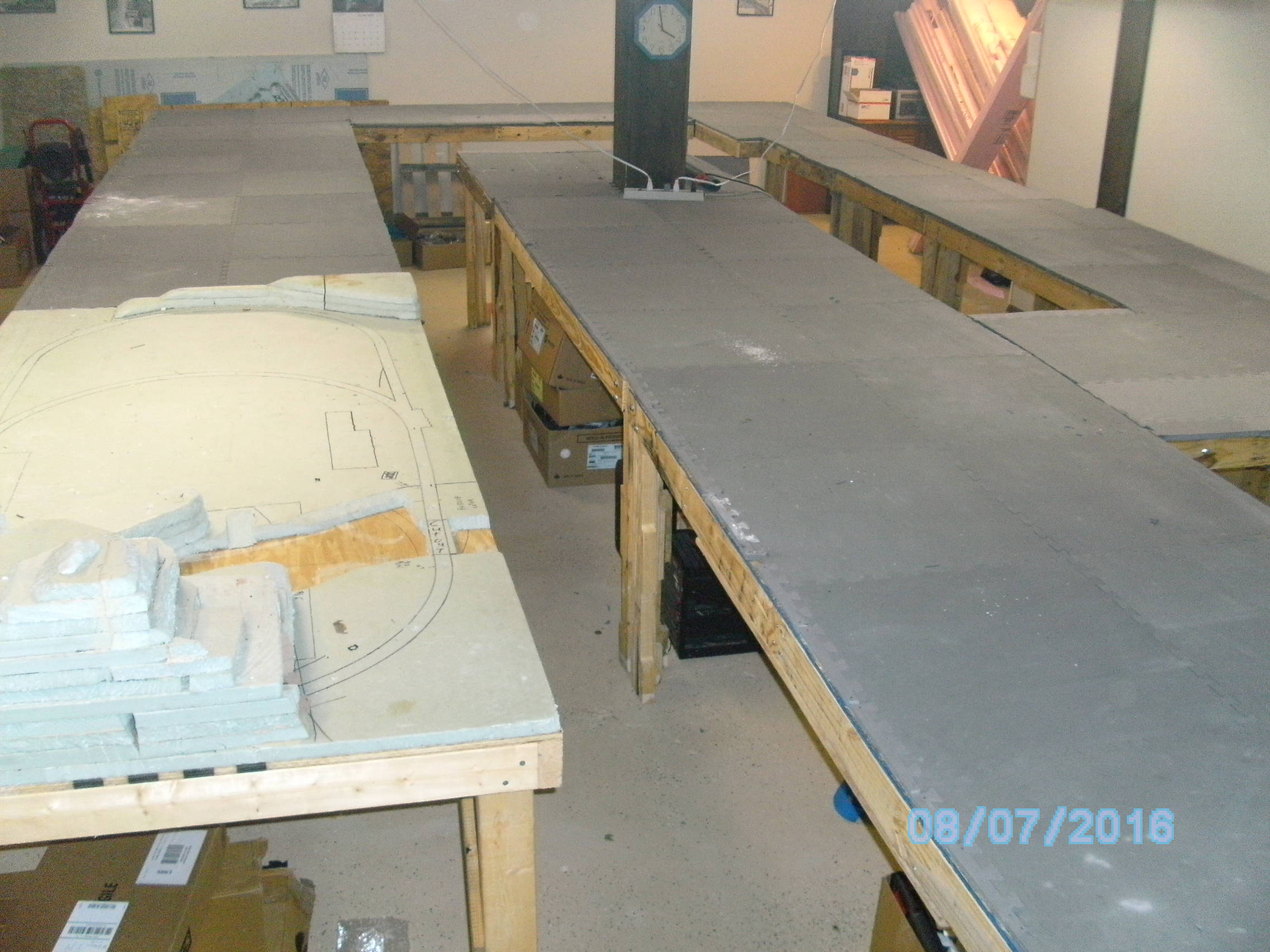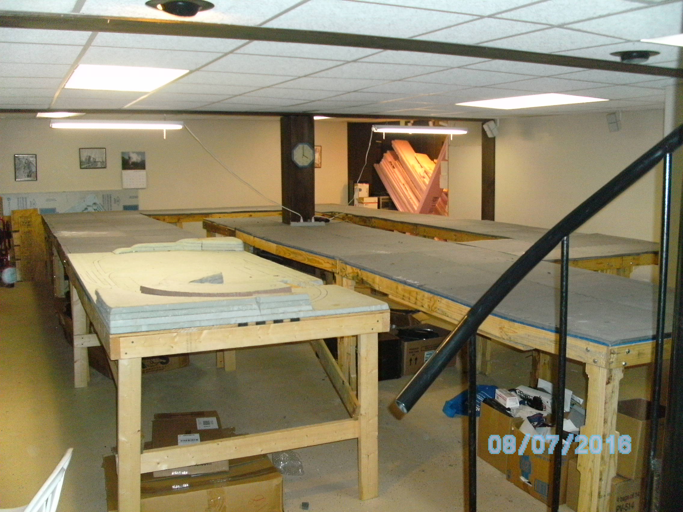 My name is Mike and my friend is Charlie. After multiple delays, like a flooded basement, broken bones and other delays we have finally come to the start of the planning stage. We first put down pink foam then replaced it with floor matting that we got for free. It is 1\2" by 2' by 2' interlocking pads. Below are some pics of it. The layout is 267 sq feet. One section we bought from a friend that had some scenery already built. This will need to reworked. Since we only get to work on it one day a week (If that) this will take a long time to complete. We hope to post our progress as we go.