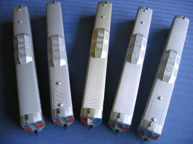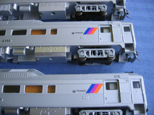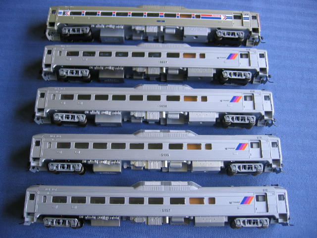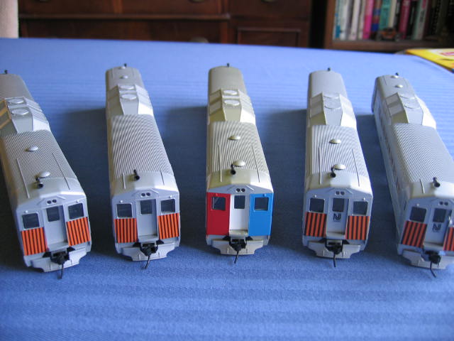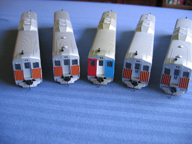 I got these 4 Proto 1000 RDC-2 cars to provide a power unit instead of using the Athearn Hi-Fi rubber band driven units. Two have the narrow stripes and the other two have the wider stripes ( a later version). All four of these units were stripped parts and paint wise. Then re-done. The Amtrak RDC-2.... I just re-painted both ends in the correct Amtrak colors to match the Athearn RDC-1/3 units, I did previousyl