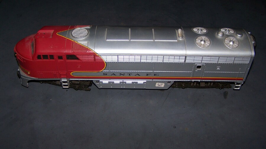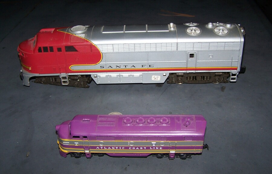 The ACL engine is actually HO scale. The Rivarossi is a 2-rail O GAUGE engine. It's a dummy, but I'd never seen a RR O gauge before, I found it at remote Flea my wife used to sell at, guy has a bunch of estate trains from his late uncle he's selling, I got this one for $15. He had another A unit, but I had other things I wanted, too. ;) Actually both of these engines are dummies, I intend to switch the ACL shell to a working chassis, most of my ACL's are faded, this one is a nice bright purple. Only $2 for it.