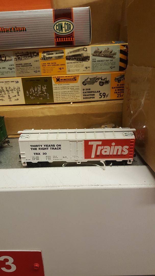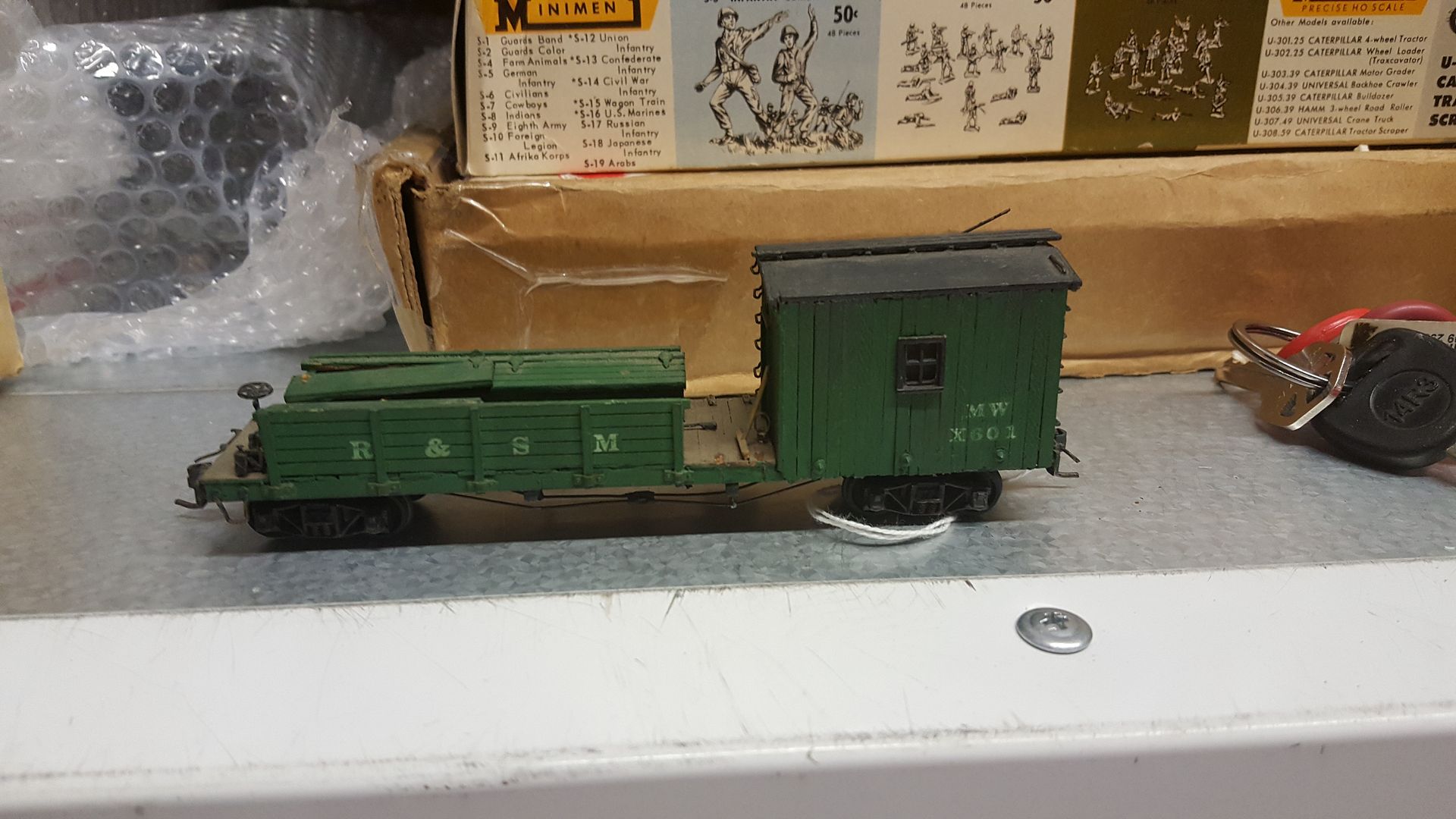 Who made these? The 2 cars are wood. The Trains car has plastic sprung trucks and hatches on roof open. Needs a weight plate. " Heck with counting 'em rivets, TRAINS ARE FOR FUN! Not called the Mad Scientist for nothing either!"