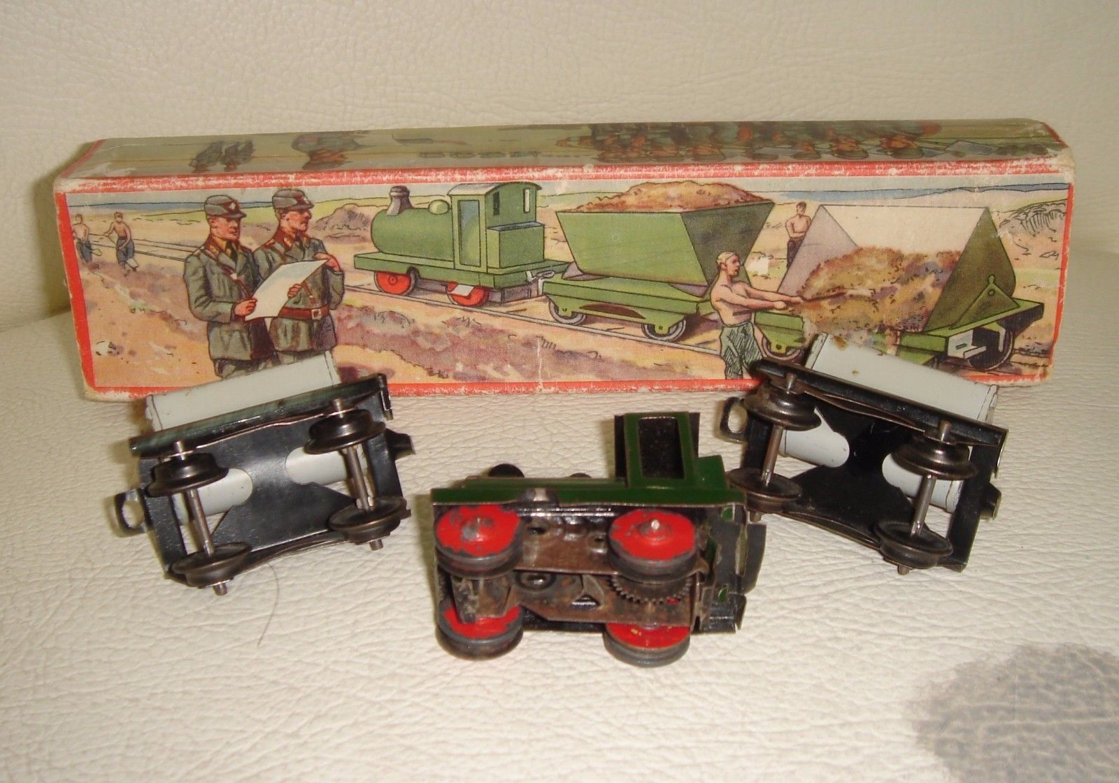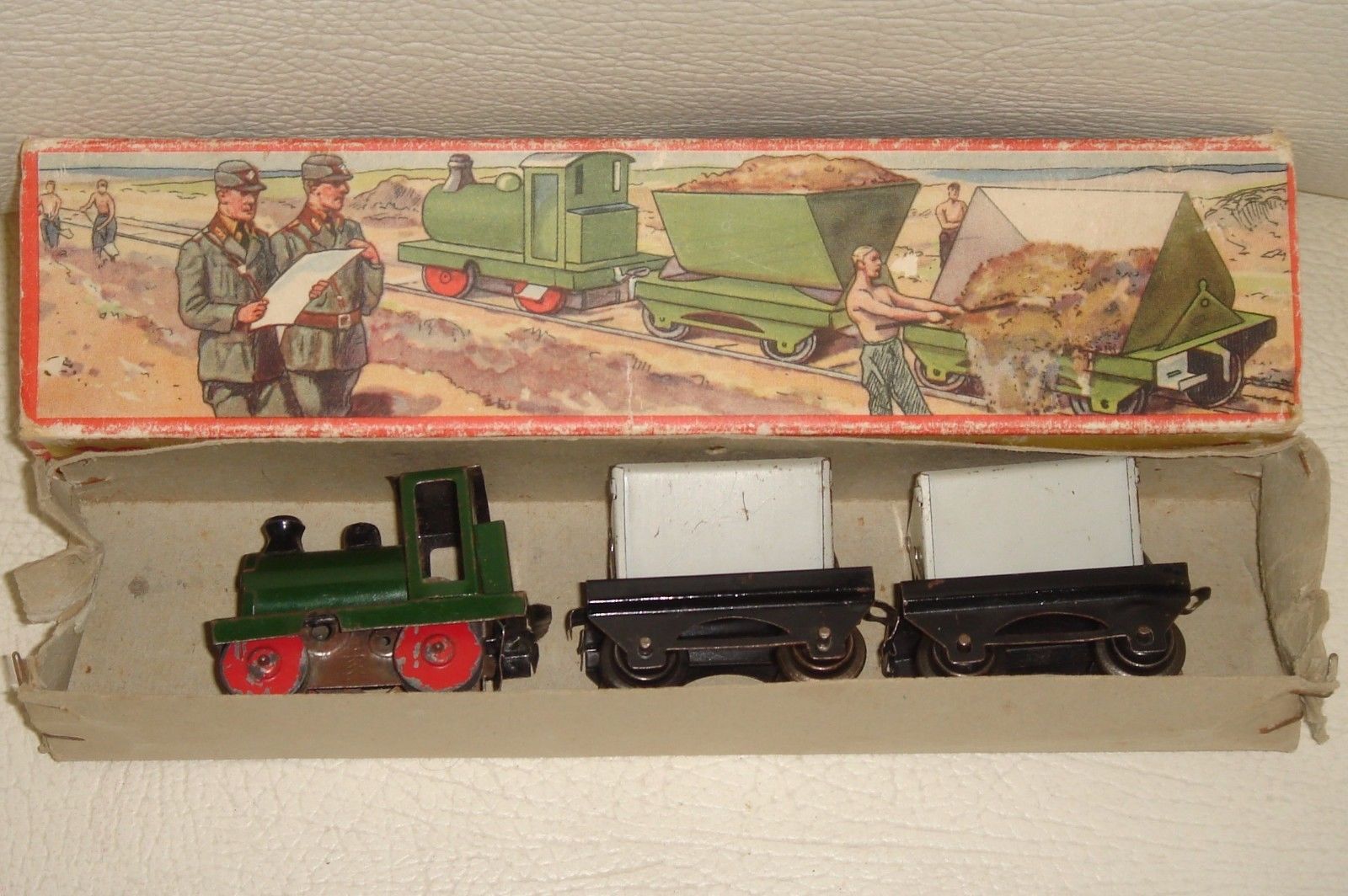 not mine,so hope it does not offend anyone,but listed on ebay,not my cup of tea,surprised no one has complained to ebay,but it is history,ken An extremely scarce and hitherto uncatalogued Bing Quarry / Slave Labour Train, made under the auspices of the Nazi Government by the newly nationalized company Gebruder Bing in Nuremberg, Germany around 1940. This train is designed to run on H0/00 Gauge track, and is in near perfect condition, and is complete with the remarkably and emotive illustrated box showing Nazi Officers and Troops overseeing work in a quarry where these small trains would have worked. Quite ironic really, as the Bing company were originally Jewish-owned, only for the Nazis to take over the firm and use their products for their own nefarious purposes - The pictures really do speak for themselves here. It is complete with the original key which works the little locomotive, and measures 24 cms long.