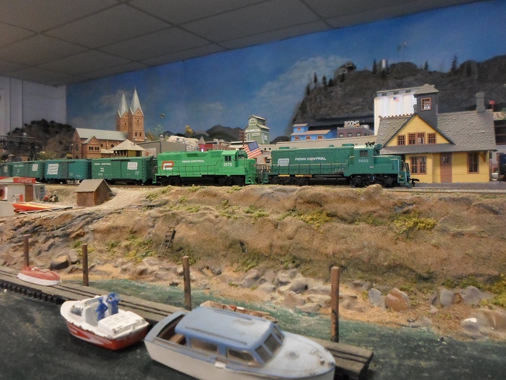 Motors howling in protest, a pair of Geeps pull the grade on the El Paso Model Train Club, earlier this morning. Lead unit is a Mantua GP20 and the second unit an Athearn brush painted fantasy scheme. In tow is a 17 car consist.