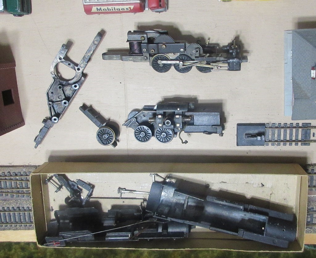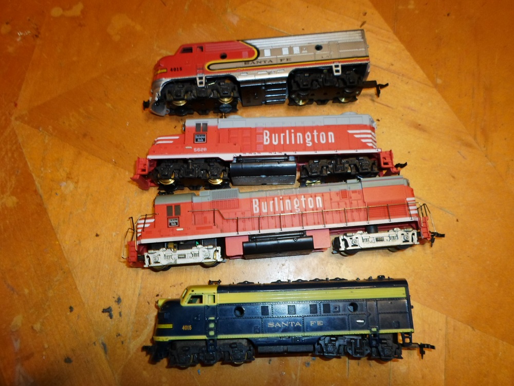 After getting educated by Kristopher on the merits and interchangability of the Mantua MU 2 motor into Tyco shells, I gathered up these four pieces and will harvest the MU 2 motors. The Burlington, and its hand rails, is destined for a Canadiana. I believe the SF F is from a somewhat hard to find set. If anyone wants the shell at the cost of postage, let me know.