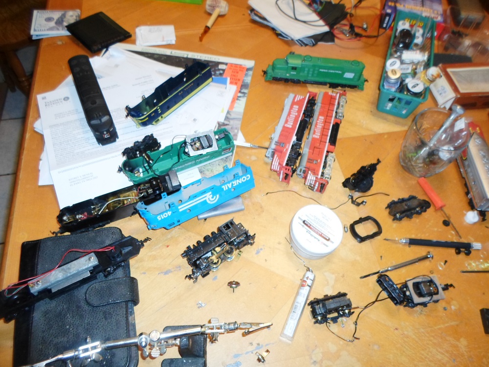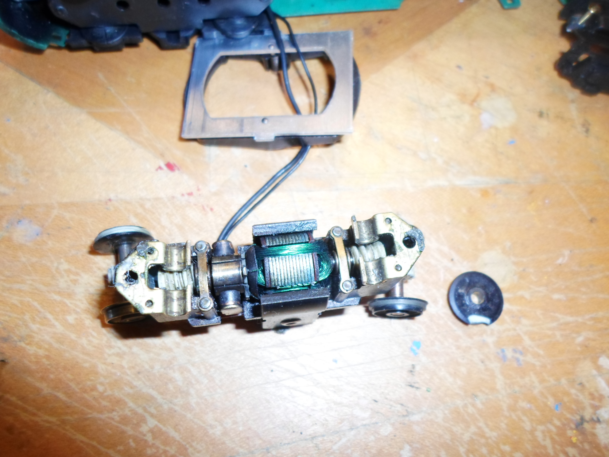 All said and done, I was able to salvage one MU I thought was broke, and replaced three all together. I salvaged the worm gear and from an AHM with a bad bearing and used it to fire up the NH C Liner, and swapped in a motor from the junk box too boot. Works great. New traction tires, also. Goody's Hair Bands. Finally, I took PC shell from the junked C Liner and was able to trim a Bachmann chassis down and fit on reasonably well.