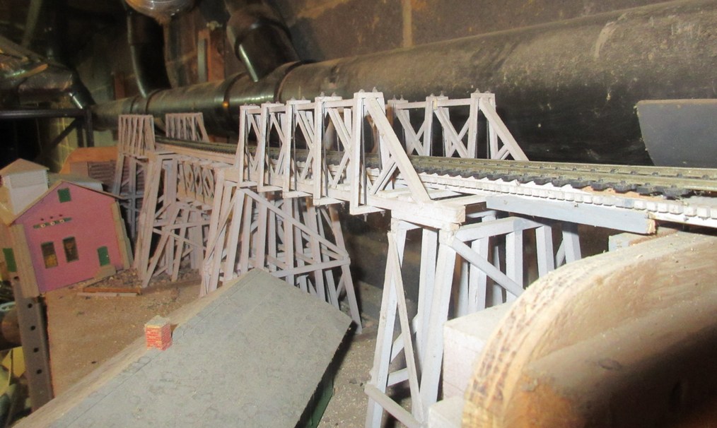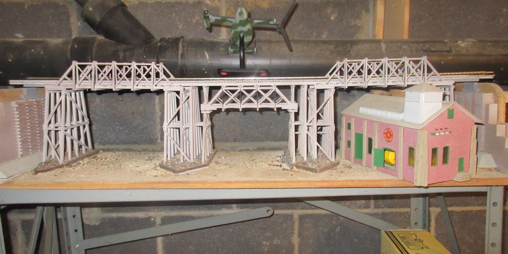 A bridge from a old layout is aviable. Layout is gone but modelers work remains. It is a single track bridge about 40 or 50 feet high. It is all wood construction with iron support rods added for extra strength. About 300 feet in length. Four tower support the span from two embankment supports, a total of 6 supporting structures. There are 5 spans. * The building see is a power station.