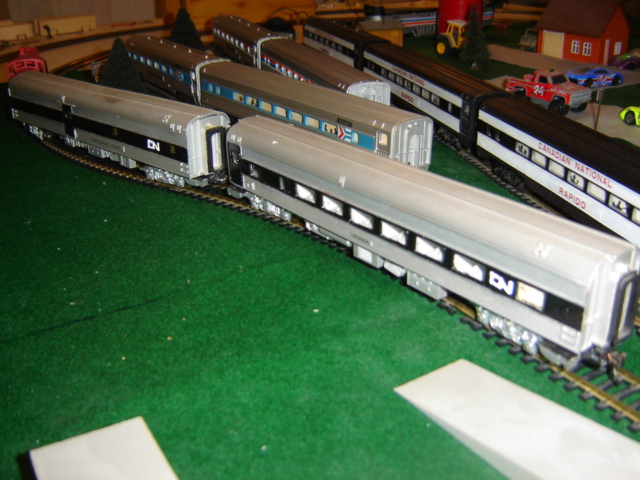 This was my first attempt at trying to paint a model train... I screwed up the CN logos, but those things are friggin tiny. Also, when I peeled off the decals, they took some of the paint with them. I'll try and fix that eventually. The black stripes look pretty good (the picture made them look messy, but they aren't in real life). The cars look better now than they did before though.