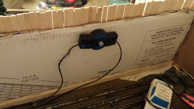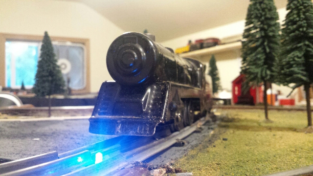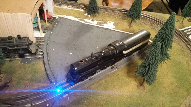 Last night, I opened one of them up, removed one of the LEDs, soldered two lengths of wire to the LED, and then soldered those to the circuit board. I mounted the main module (powered by a watch-cell) on the wall inside the roundhouse. I routed the wires over to the turntable lead, and glued the LED in between the rails.