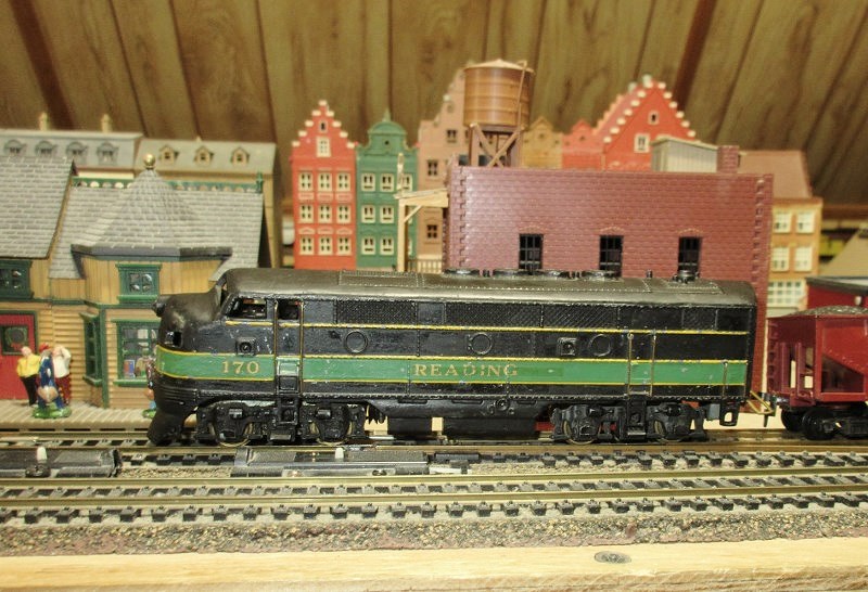 ** My loco of the week is a 1947 Varney cast F3A. It is painted for the Reading. It has the variable 3 speed motor drive. slow, normal, and fast. I cleaned it up a little and oiled it. Then tested the drive in its middle speed. It runs smooth on the test track. * I'll post some photos and find my link to a video of the test.