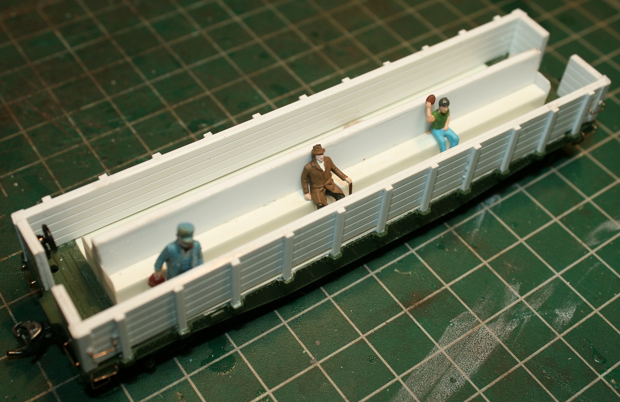 Sometimes open air cars are set up for standing passengers only, but if you prefer, a bench can be fashioned out of styrene as well. Use a scale rule and some HO scale figures to determine the proper dimensions for realistic looking seating. I chose to make a bench with a back rest but plain jane plank style benches can work too.