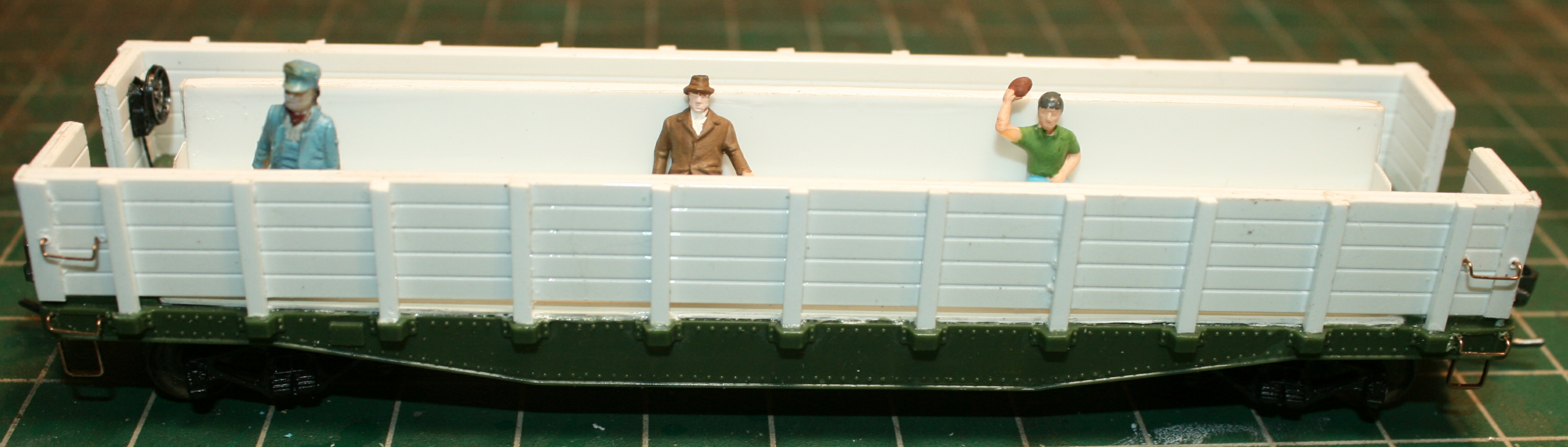 Lastly, don't forget to add mandatory safety appliance details for a final touch. Remember that your excursion car needs a hand brake, grab irons, and stirrups just like any other freight car. Refer to pictures or models of gondolas for placement ideas.