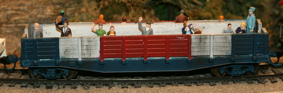 I see on closer inspection that I had some red paint bleed through onto the white areas. I may have also over weathered the car but I wanted to simulate the appearance of an excursion car that was being pulled by a soot spewing steam engine. The figures I used were ones I happened to have on hand but some of them may be a bit over dressed for a steam excursion.