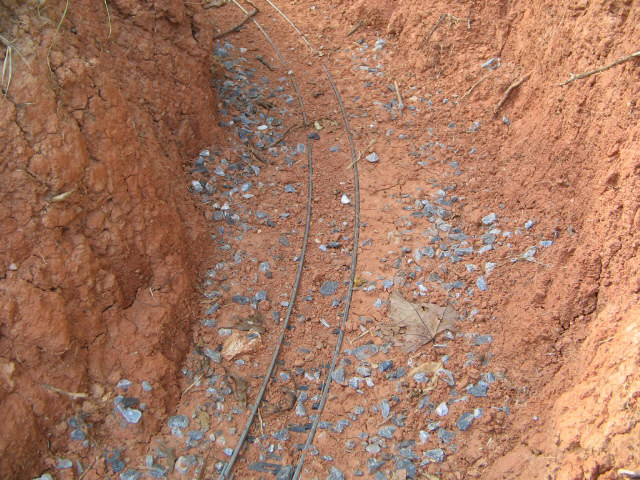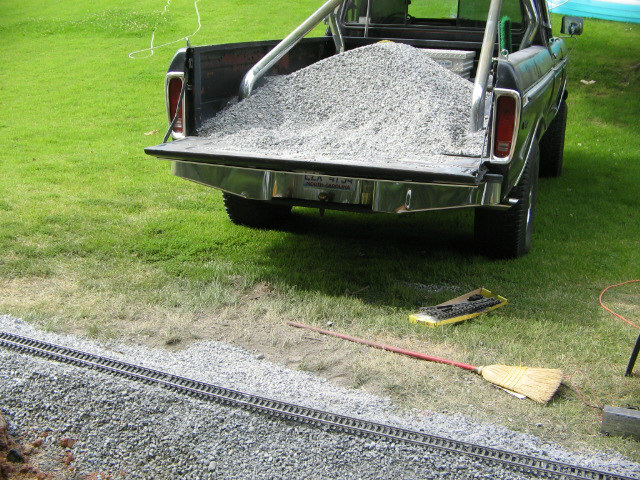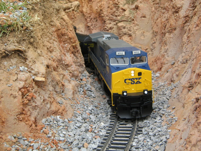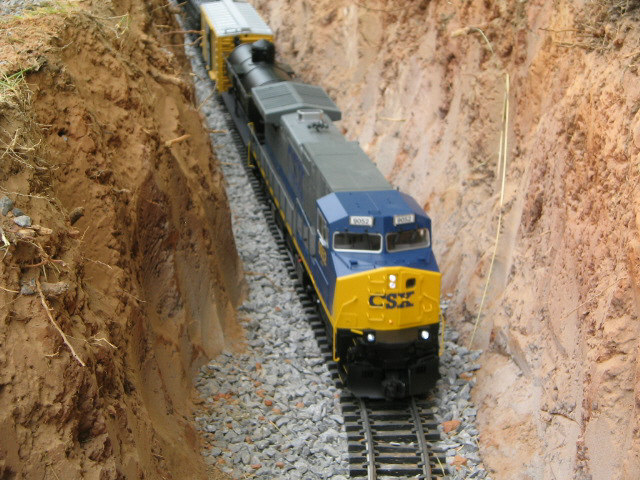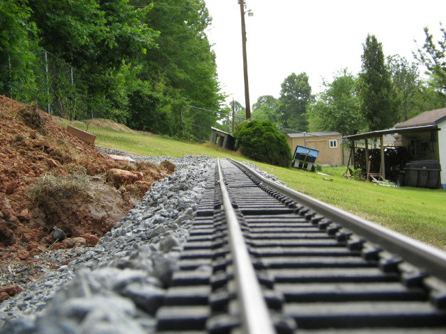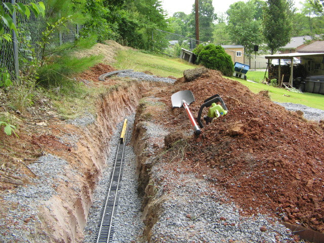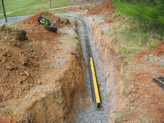 Here are the pics that some of you were requesting. I am currently regrading the track as level was off bad. Had to dig trench a little deeper and then refill some to get track level. Look at pic closely to see how my back yard has a steep slant which is reason for the canyon look. It shouldn't flood with water but it is possible with a very hard rain over 2 days-hope not-it is level in the trench area and good base of p gravel. Gravel will soak up water. i will have more pics this evening and hopefuly a new video up.