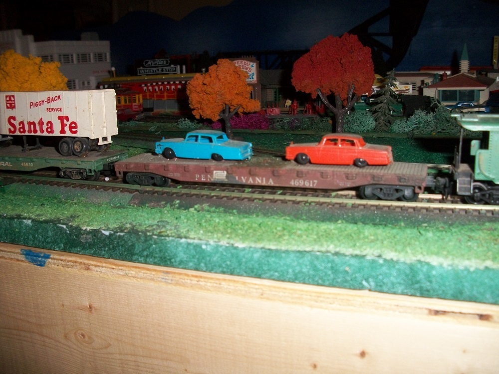 Couple of what I think are Studebakers. Perhaps someone can better ID them for me, riding upon a former PRR flat. As bankruptcy loomed, the PC had a habit of crudely blotting over with a cheap stencil rather than repainting the entire unit.