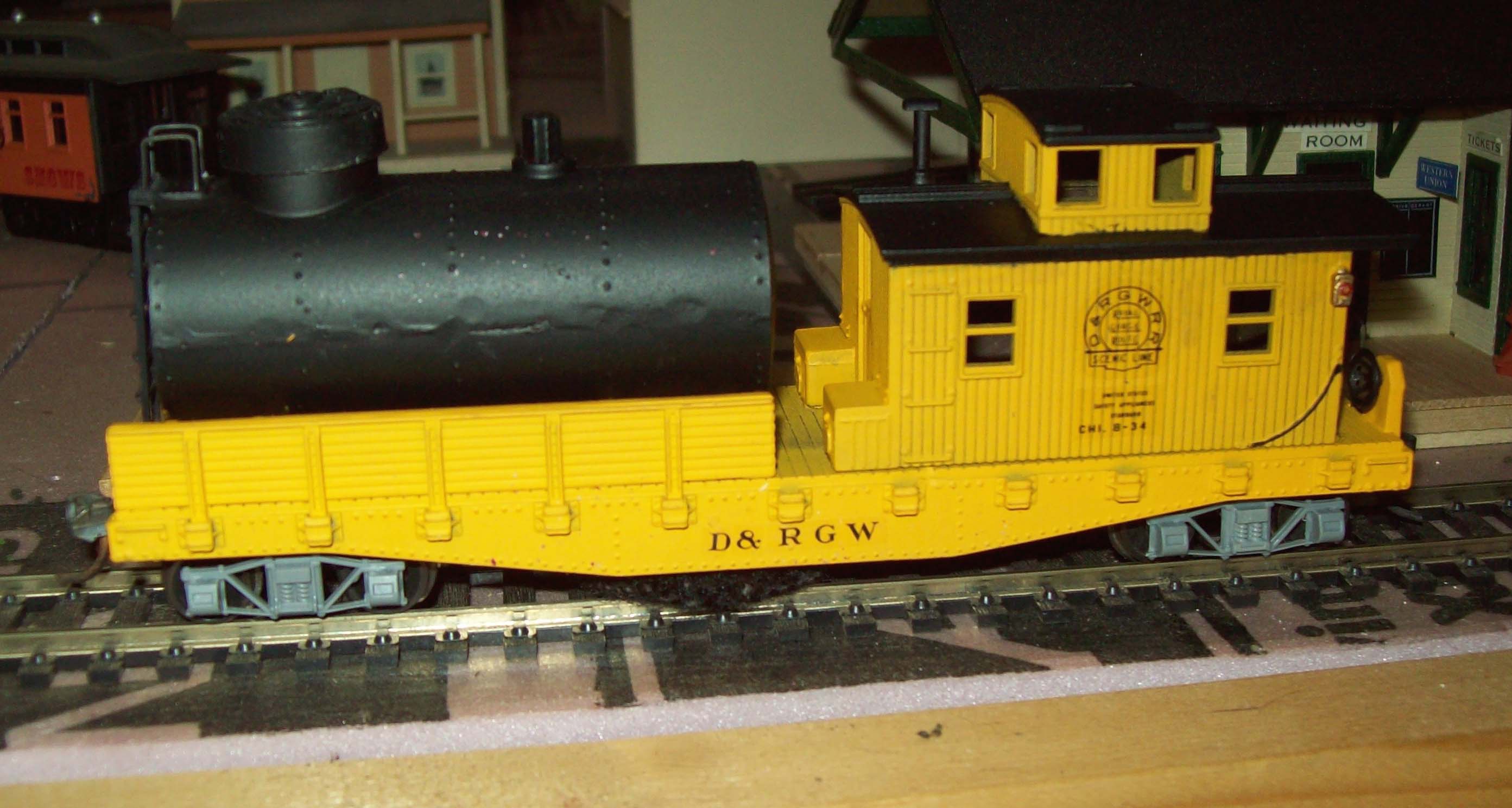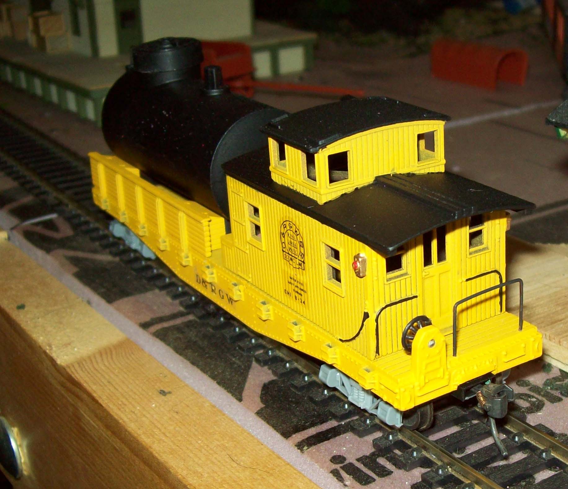 My car this week is a Life-Like conversion track cleaning car. Stripped the old paint and repainted it Railcar Yellow and decaled it for D&RGW. Used Tichy Group archbar trucks with NWSL 33" wheelsets and Kadee #5 couplers. Works like a charm.