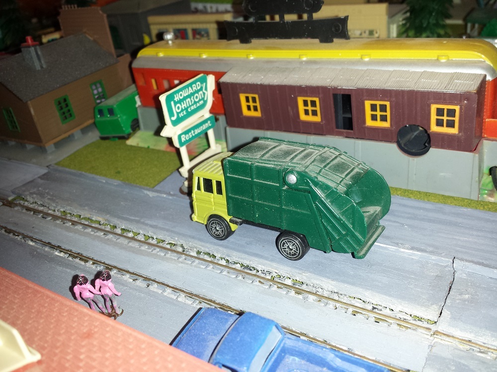 Garbage truck on the Tyco Expander Layout. I spent some time in my squandered youth hurling garbage into such a conveyance. Nietzsche wrote, "that which does not kill us makes us stronger." Sometimes it just kills you, too.