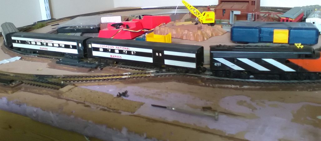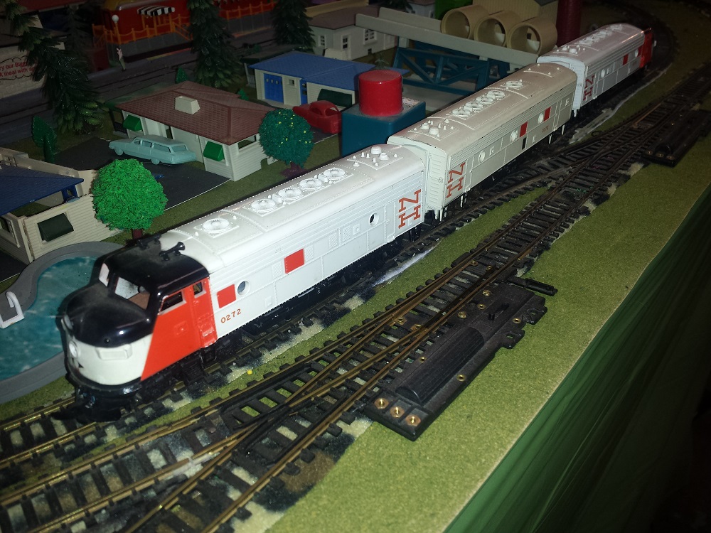My trio of Athearn F's in rare Snow Bird scheme. All units powered, as all 24 wheels are needed to hoist the 35 car, mostly Tyco consist, about. Many folks suggested that the Snow Bird scheme was a fantasy job, but it was the scheme used on the Dan'l Webster, a crack NYC to Boston express that got snuffed out by I-95. Here she is making revenue: https://youtu.be/bCVkssaVReU I set the video link, somehow I managed to boff it the first time around. It's short, to the point, hope you enjoy it, hope it works!