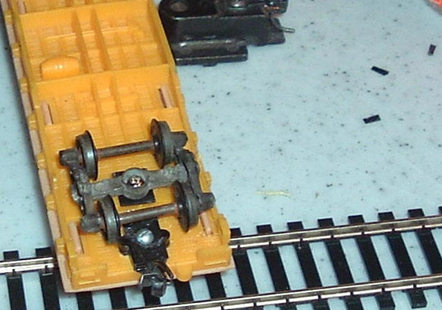 I've found that a .030" thick piece of styrene covers most cars AHM makes. This can come from a variety of sources including old credit cards. I just glue it to the underbody, lightly glue the #5 box and all to the shim then check the height gauge to make sure it's right. You may have to swipe it with a file or add one or two Kadee washers but most times it'll be right on or near enough. Drill for a small screw for strength and you're done. This is a Tyco flat that didn't need any shimming.