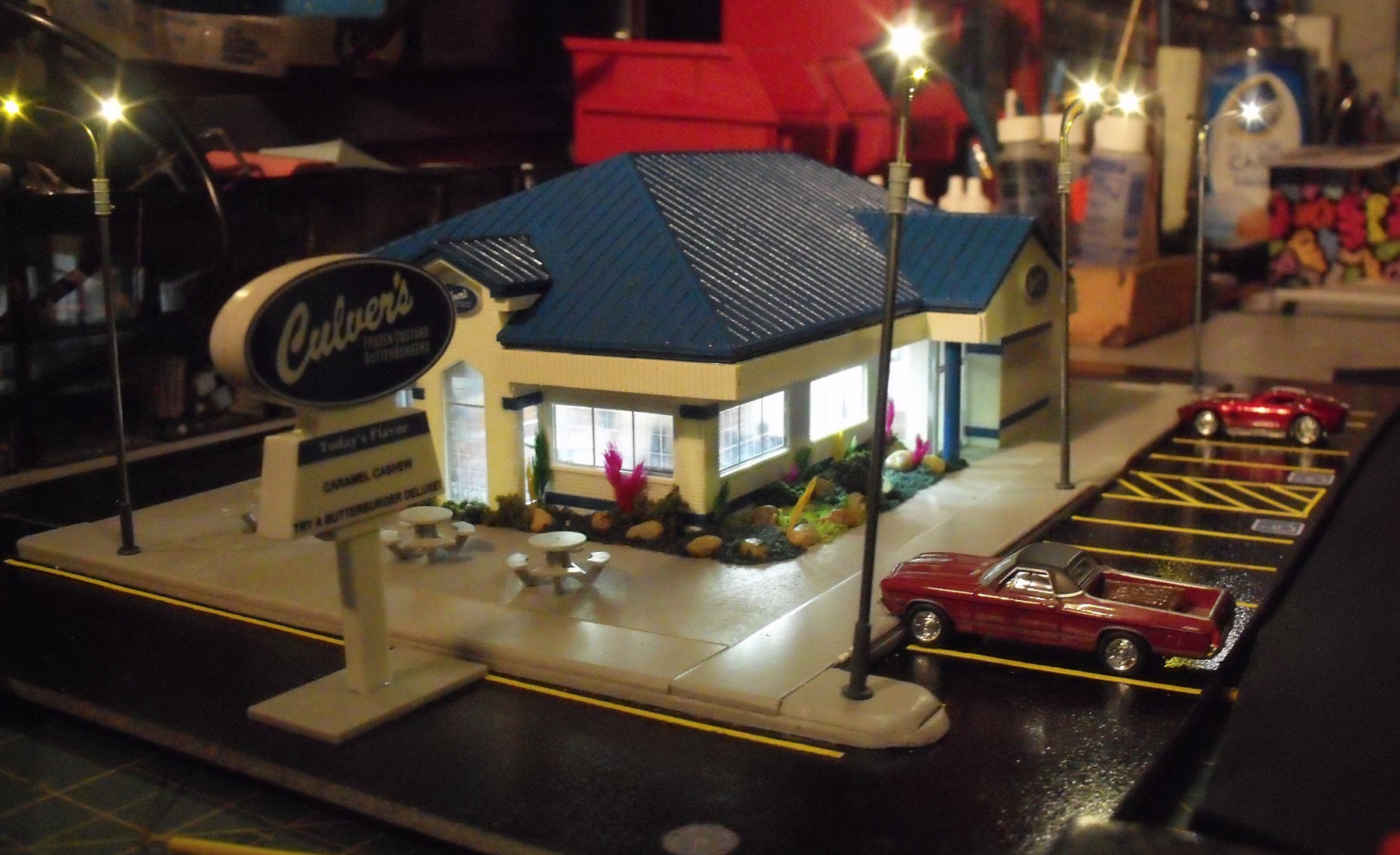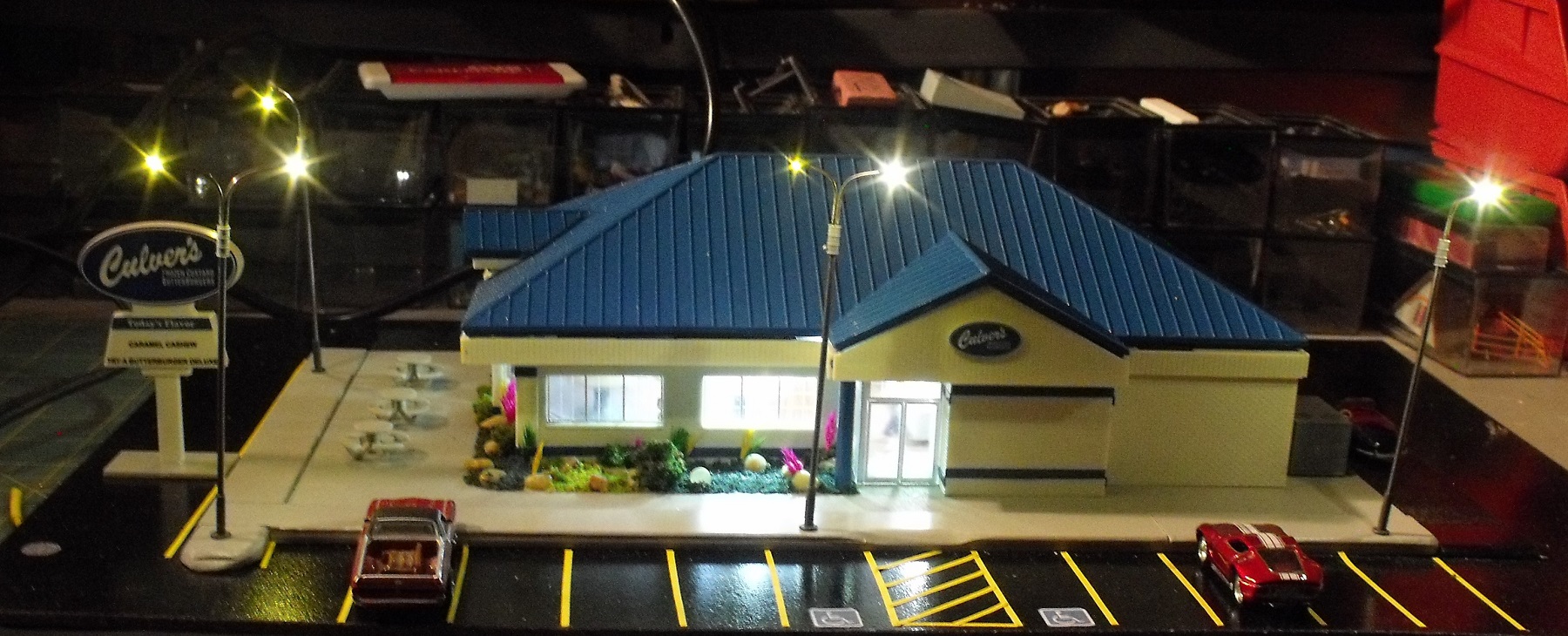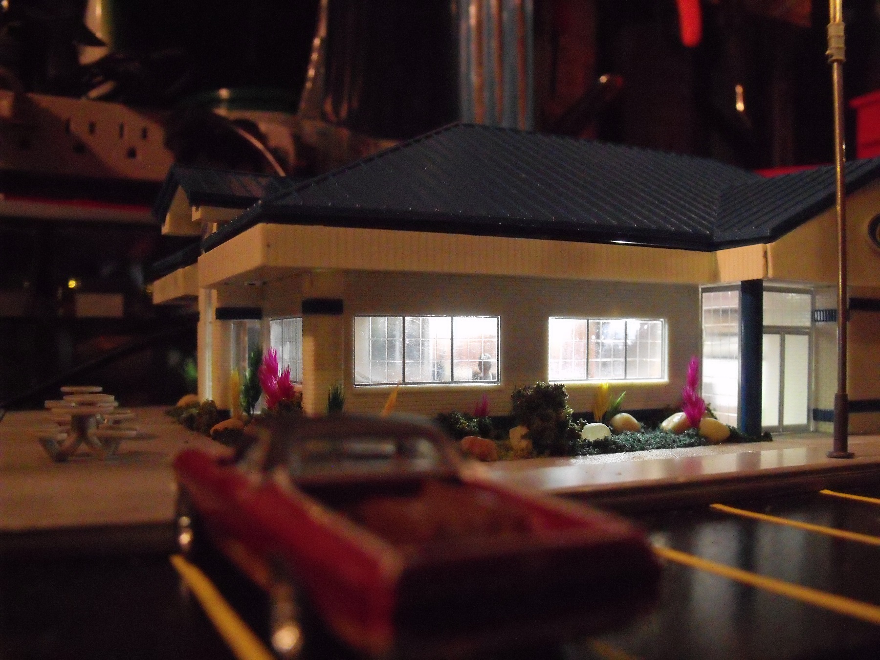 Thanks for the kind words everyone. Microbuss - Sign is awaiting placement for when I get it on the layout. I also have to add the table umbrellas and trash cans. I can't get the roof on as tight as it should be. I'm really happy with the street lights. Master Of Plasticville