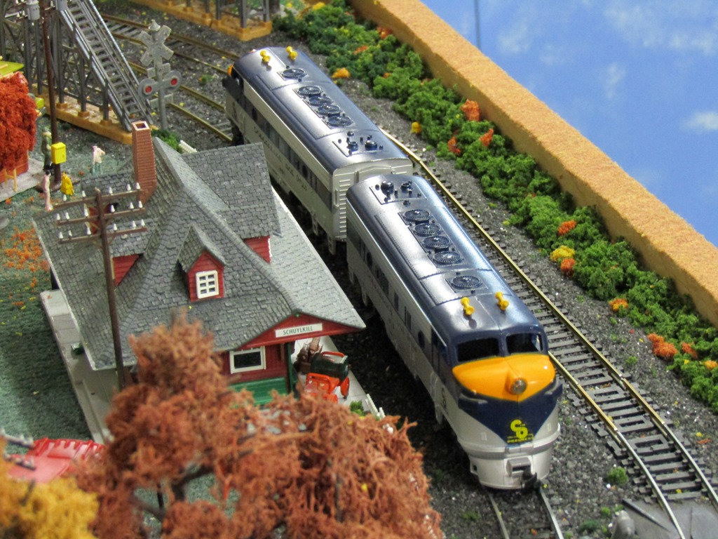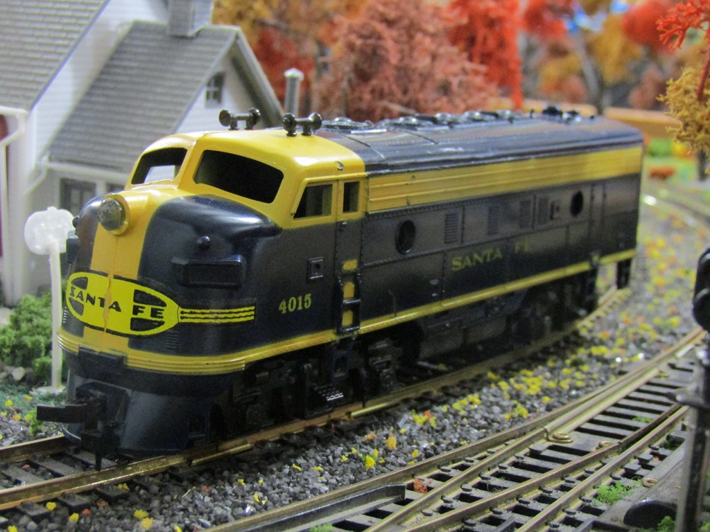 Very excited about this one -- a vintage 1960's Santa Fe "Blue Bonnet" F9 #4015, with screw-in trucks!! I was fortunate to win this one at a great price last weekend, and here it is on the layout -- my second "Blue Bonnet" ATSF schemed Tyco (the other is GP20 #5628.) This locomotive, like others of the "Red Box" Made in the U.S.A. era runs excellently, pulling 7 cars without new traction tires at all.