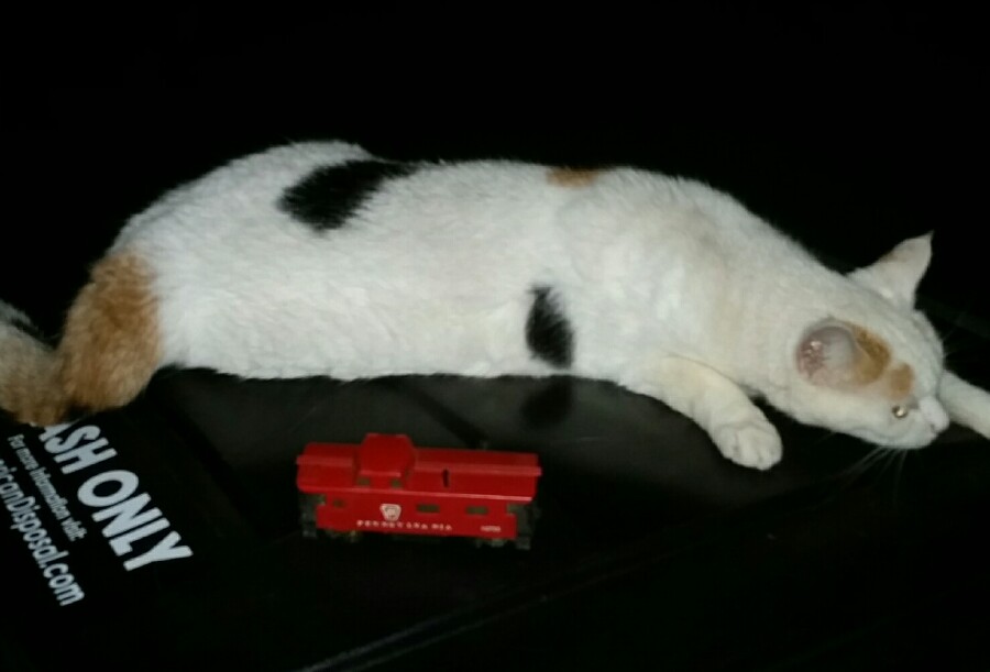 Wow, NO one started a thread on COTW this week yet?! Ok, here's my Cat of the Week ( er, car ) photo. Featuring a Virginia dumpster and a lighted Tyco caboose. And my cat Juliette ( Roameo died over a year ago, sadly ).