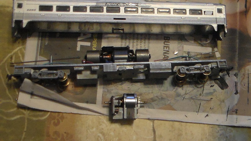 any time soon. A. I have limited ability for this sort of thing, and B. I rarely have the right tools and screws even if I did. As last posted, I burned up a vintage motor, old as I am, and yikes, I really like my Budds. Necessity being the mother of invention, I dug out this Athearn dual flywheel motor, and with the help of a kitchen knife, a screw that I had to guesstimate and clip off with a dull wire cutter, some balsa wood, a little solder and a stray chunks of plastic I was able to replace the motor with an even more reliable, more smooth running one. I like to keep vintage vintage, but as you can see, I plastered over the original road name with hand brushed silver paint, half dried out, and then some PC decals and a phony number. I was watching some PC rail fan film last night and the actual PC front ends sported these ghastly white and orange stripes that looked as if they had been plastered on by yours truly and his half dried paint and stiff brush. I like my PC better. Anyways, I'm pleased as punch with myself, never thought I could re-motor a thing, and have always gazed in envy and admiration at the skilled artisans who post here. Sorry to blog, I'm a Chatty Cathy today.