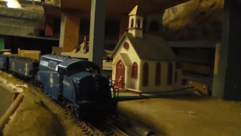A throw away shot of my BL2 pulling a coal drag past a church on the El Paso Model Train Club. I always liked the way General Motors seemed to be trying to give their locomotives that unique '52 Buick kind of a look. Here it appears to be pulling into the church parking lot, like an automobile it was mimicing. (Its a NOS AHM, ah, she runs fine and pulls well).
