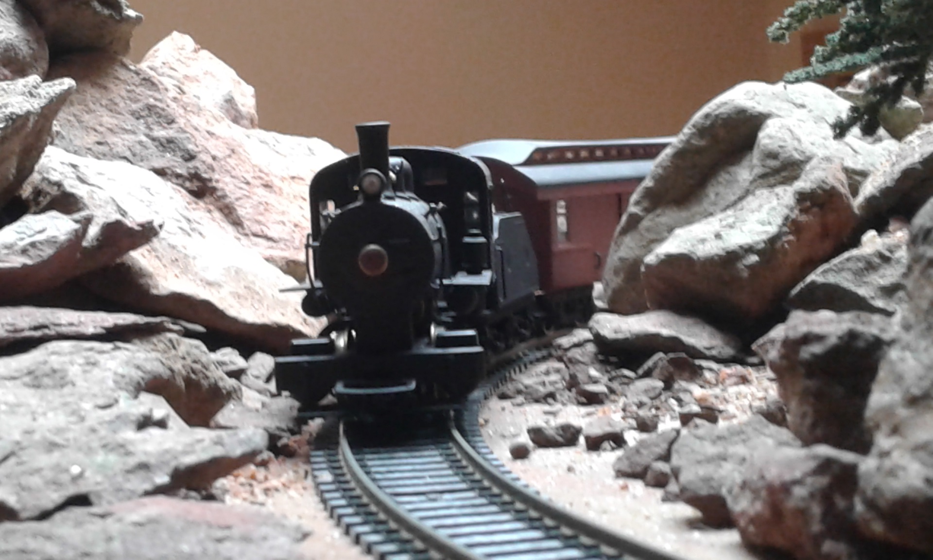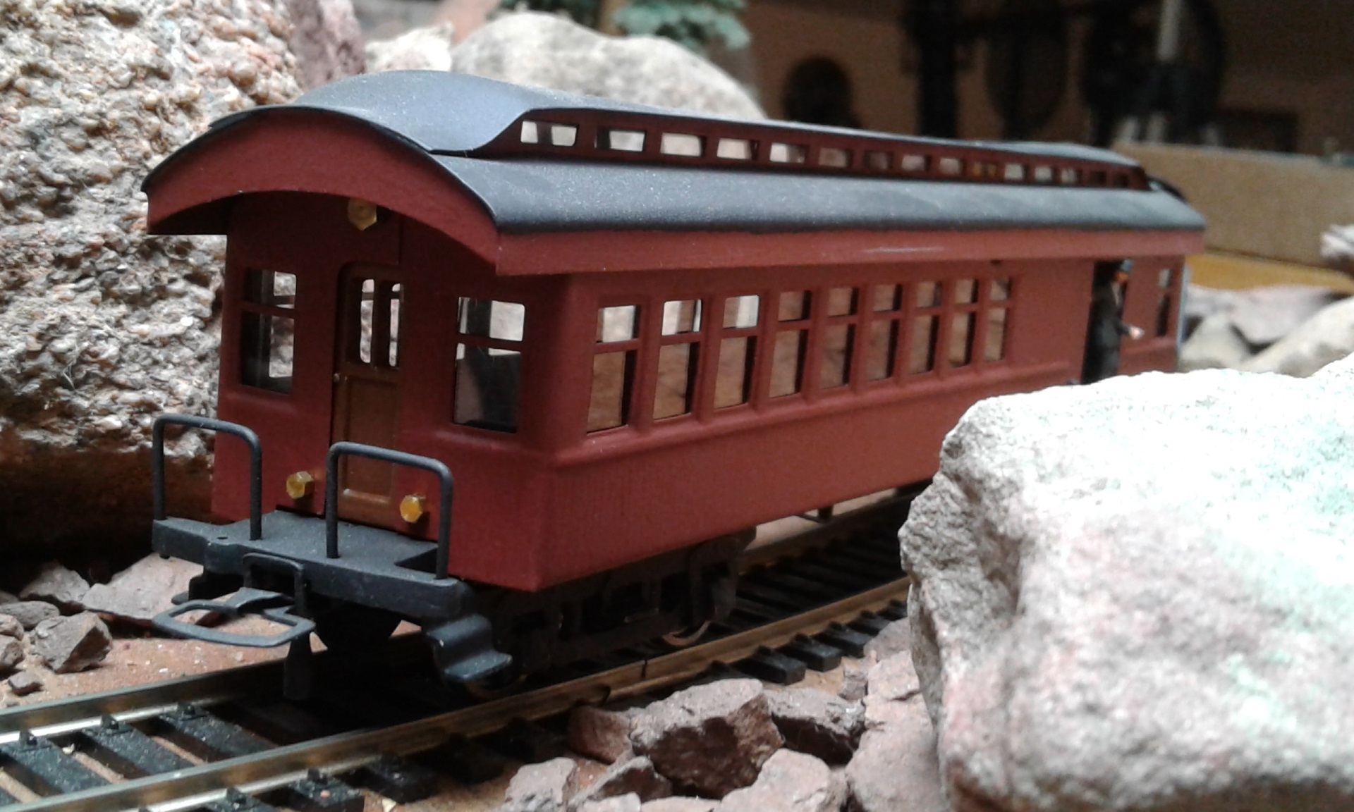 Simply elegant and beautiful in design and function. Evokes a grand time now gone. The marker lights by the door are a great little touch, as is the conductor hanging out the door looking back. Isn't that the Mite that you rebuilt practically from scratch? Fine look pieces and the granite dells remain your signature touch.