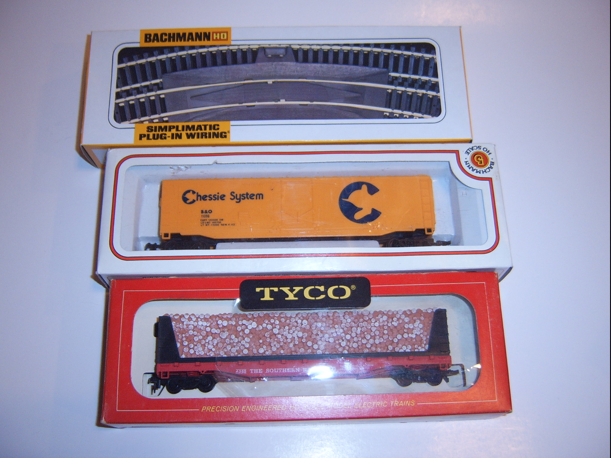 Partial box Bachmann track. Bachmann Chessie System boxcar. Tyco pulp car-tear in cello.