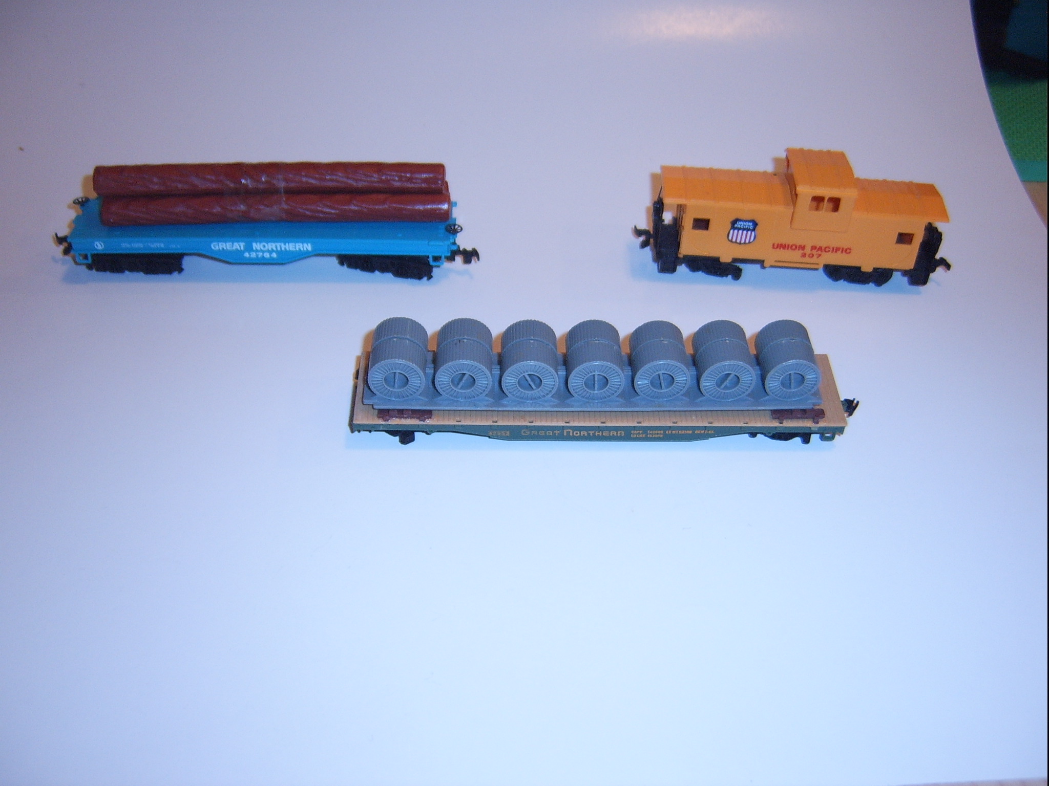 Bachmann blue log car. Bachmann UP caboose. Tyco cable reel car-missing wheels.