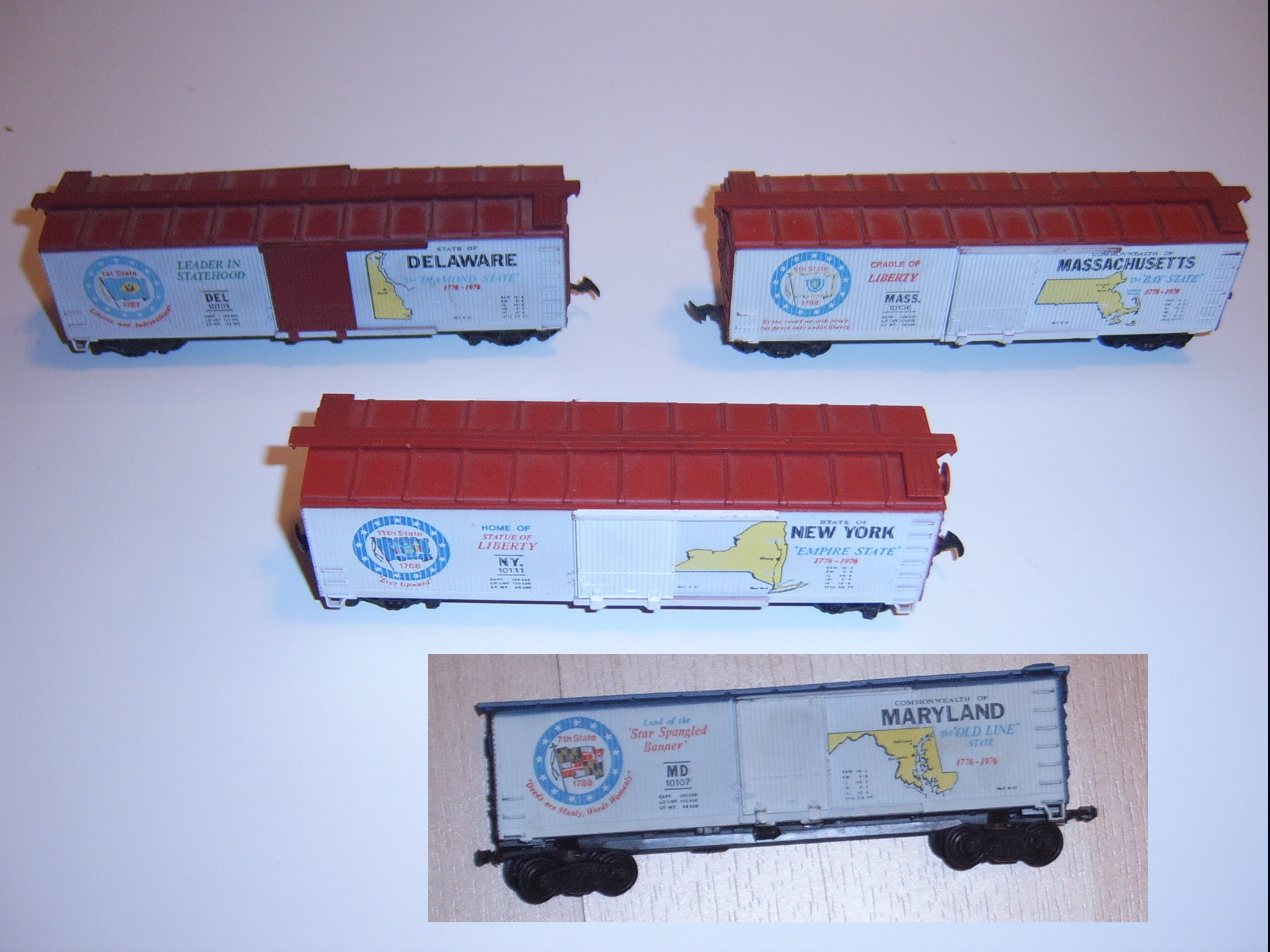 4 state boxcars, not sure who made them. Maryland, Delaware, New York and Massachusetts.