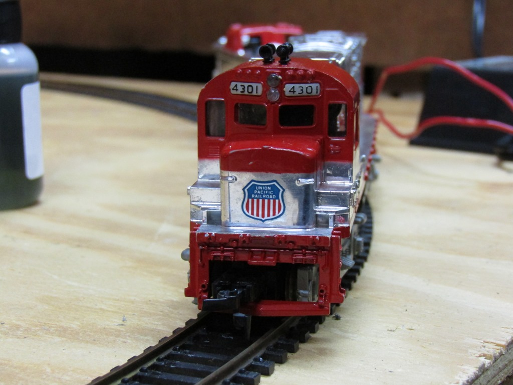 A Silver Streak C430 locomotive #4301 & caboose I won on Ebay last week for $14, with shipping included. This locomotive is a great runner, and with new traction tires, it appears to run well around my LTT! This particular Silver Streak C430 is in pretty good shape for its age, and is the "older version" I believe, in that the logo on the nose has "Railroad" under Union Pacific. I installed 2 new Horn Hook couplers & traction tires, lubed it with Liberty Oil, and plan on handrailing the locomotive also. Will post under my roster then!