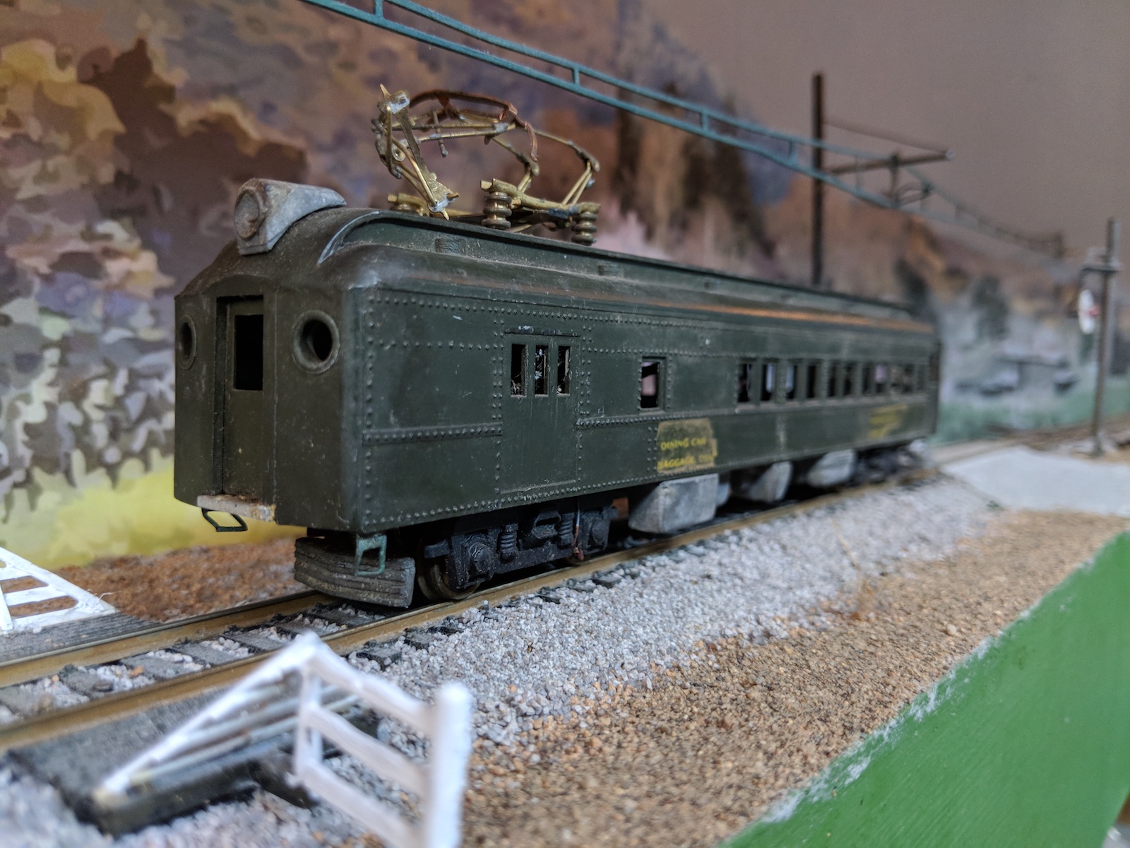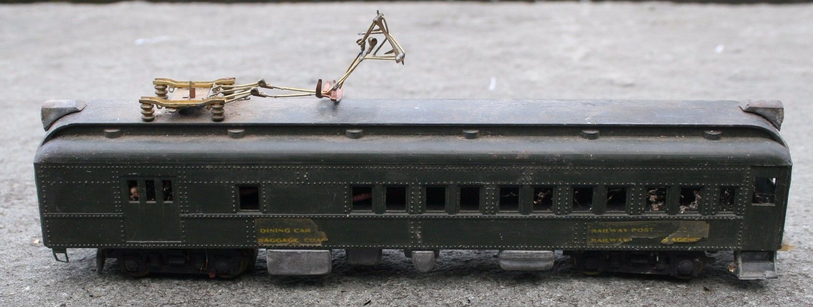 Here is my latest acquisition, a motorized interurban. I will need to replace the pantograph as you can see. I believe this is half of a Pittman Bride and Groom set that was available in the 1950's. It looks like Pittman used a John English coach and combine as the basis of the set.