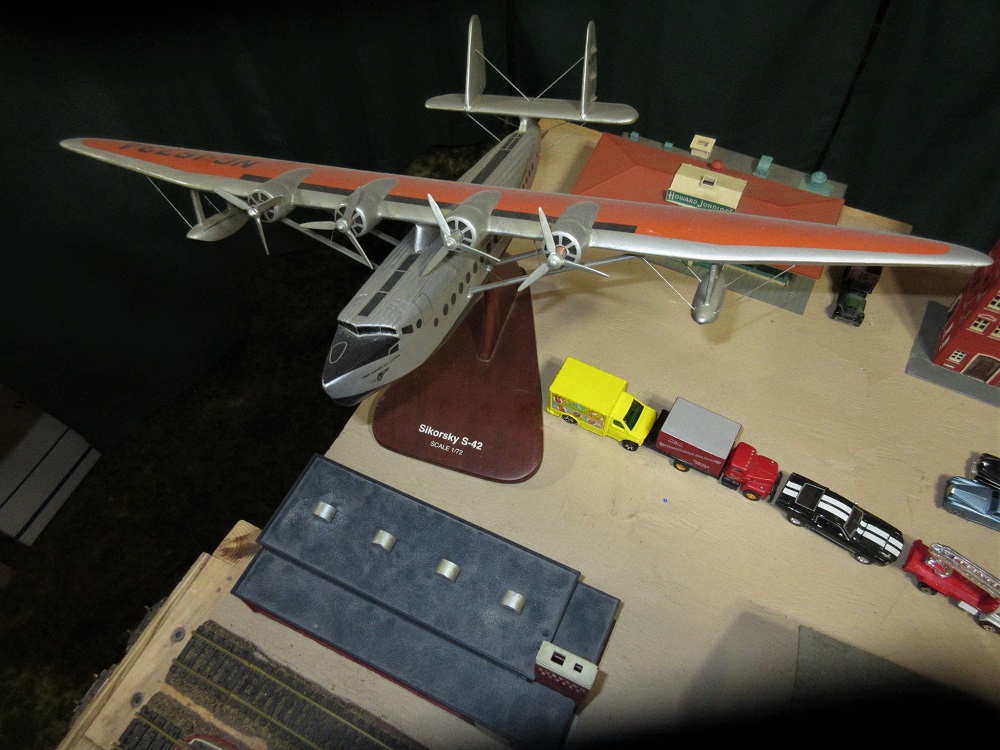 Oh, My! What can this be flying around the ceiling of the layout room? A Pan American Clipper. A Sikorsky S-42 Flying boat.