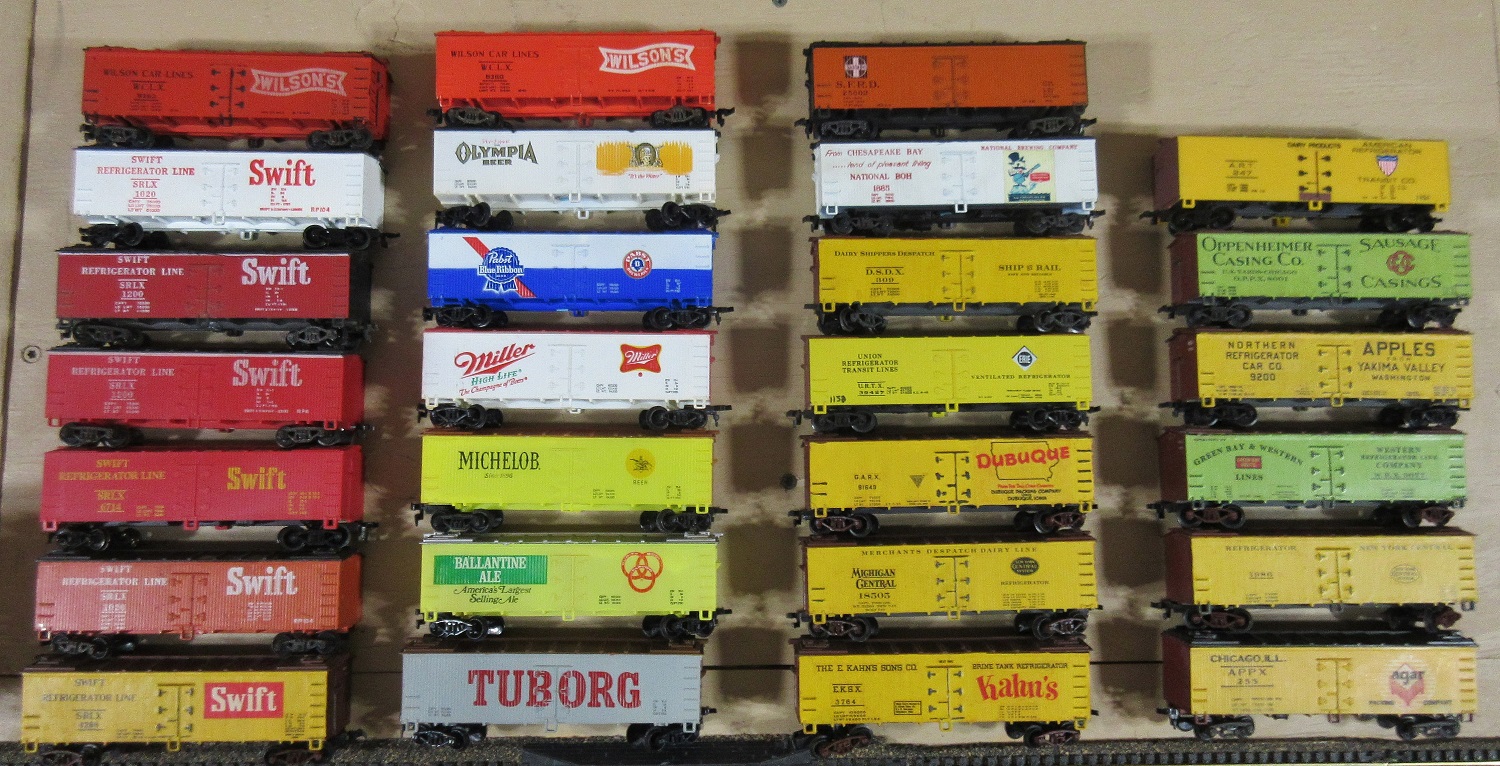• Wow, this is a good start to this week. Sean your Models incorporating Alco PA1 is a rare piece that just seeing it is cool. Mike your pair of Mountain SD’s I’ve never seen double heading. Ben your FORD center cab is a very hard one to find in any condition. Yours appear to be like new. A great find BUSS! Robert, you’ve really done a good job with that repaint. The NYC black paint brings out all the detail that the Century 430 is said not to have by its TYCO haters. Tyco really made a good model. And those MU-2 drives, like the rabbit with its drum, just keep going. • Now, what can I do? I guess not much. Here are my Varney and Lifelike plastic reefers. The ones that just sit on dealers tables while the train show attendees just pass them by, looking for the great find that will increase their collections value. I think they are nice cars. If you look the 6 pack is there, completely. They do run well for me. I look for ones I don't have. There are 7 or 8 of these I bought 10 years ago at the clubs show from an old member that always had the same table in the Gym at the Mother Seaton show in Clark NJ.