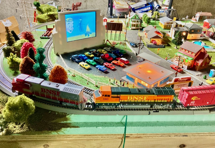 The GE Fakebonnet-led BNSF freight rolling past the Skyview Drive-In Theater, now with a playground!
