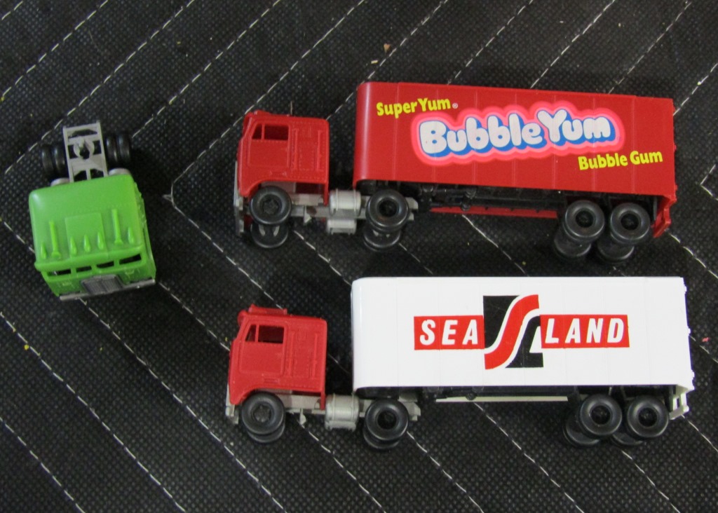 My current Kenworths: The Bubble Yum tractor trailer I traded with Chops for , a NOS piece! - Below it is a Sealand tractor trailer, and last but not least, a green Kenworth cab-over truck I received in a Piggyback Loader set (which has been posted under SOTW.) :)