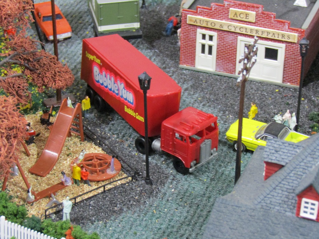 The Bubble Yum tractor trailer was placed on the main drag near the playground, for it to be seen right away as one looks at the layout!