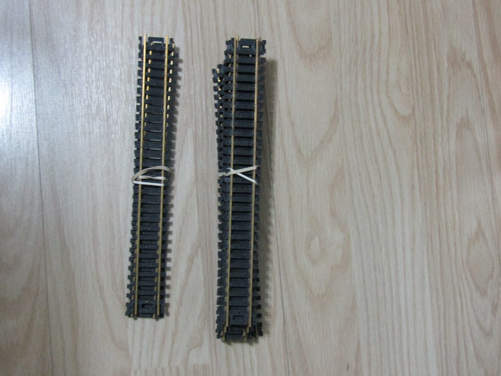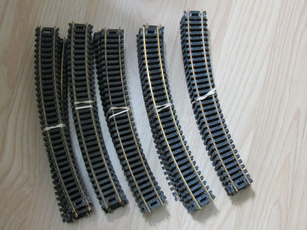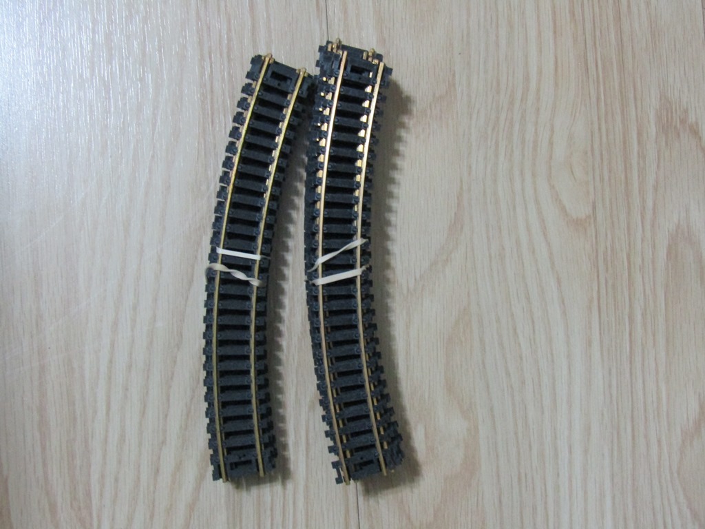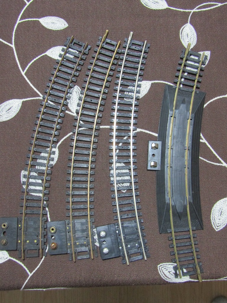 2 brass Atlas power curve tracks, 1 Atlas nickel rail power curve track, and 1 Tyco power curve track.