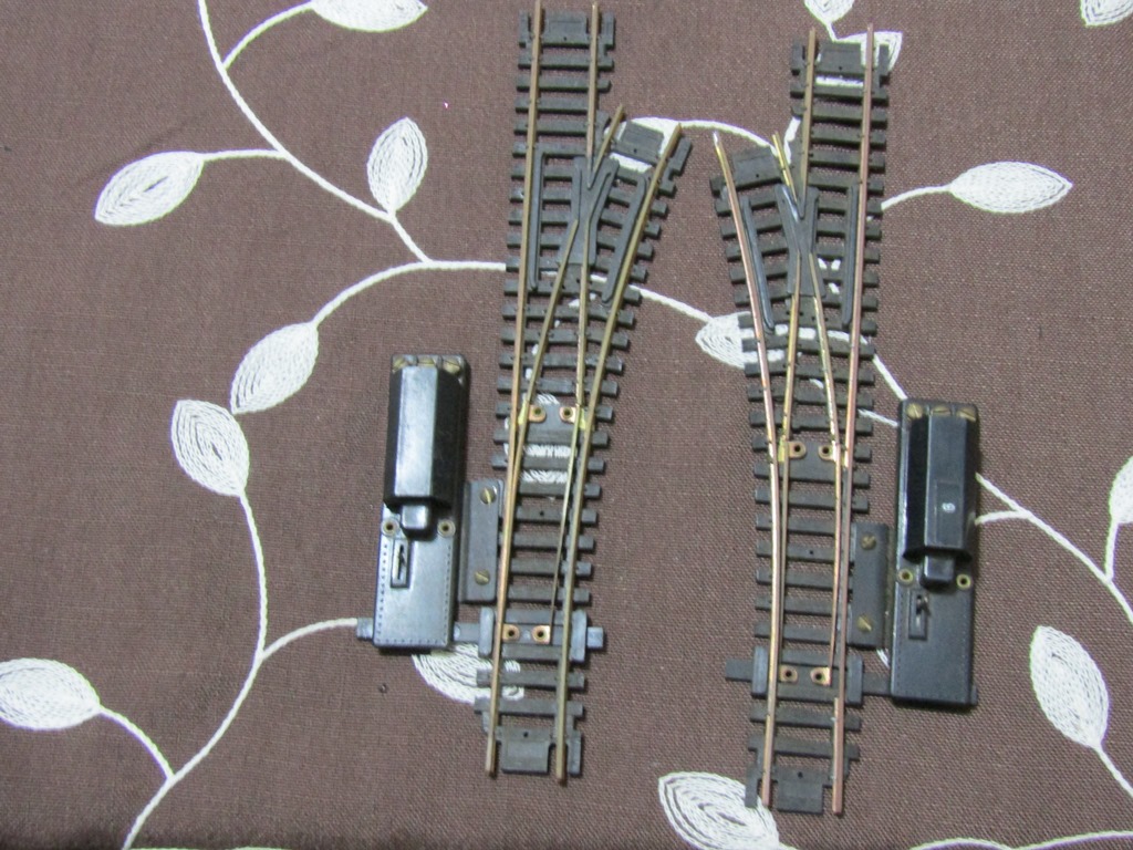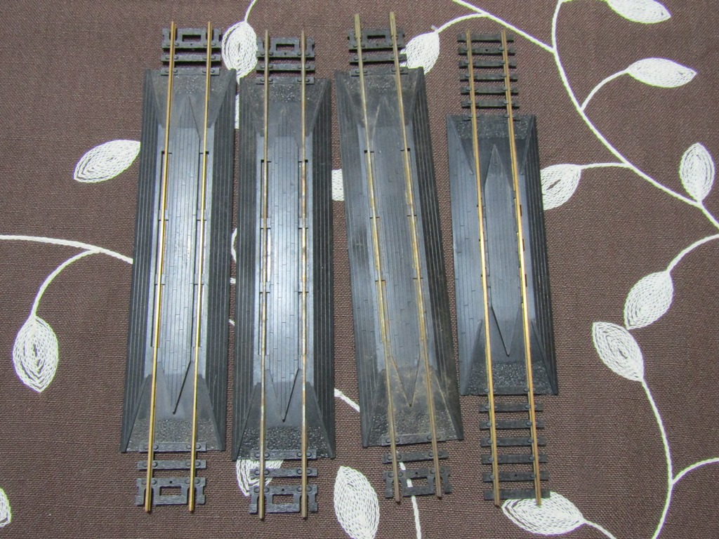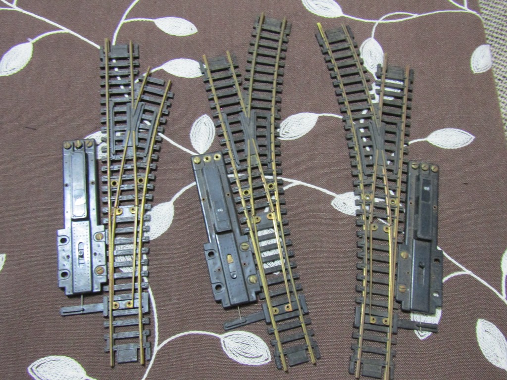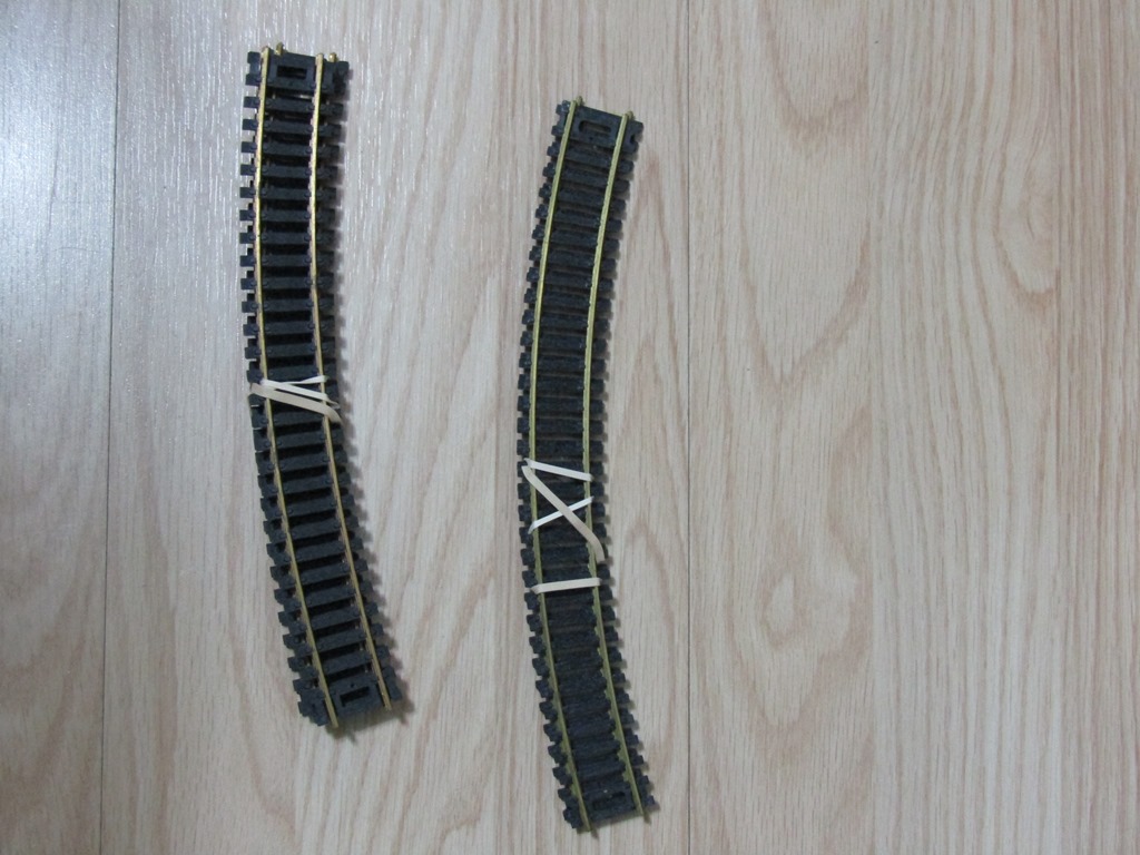 2 brass Atlas power curve tracks, 1 Atlas nickel rail power curve track, and 1 Tyco power curve track.