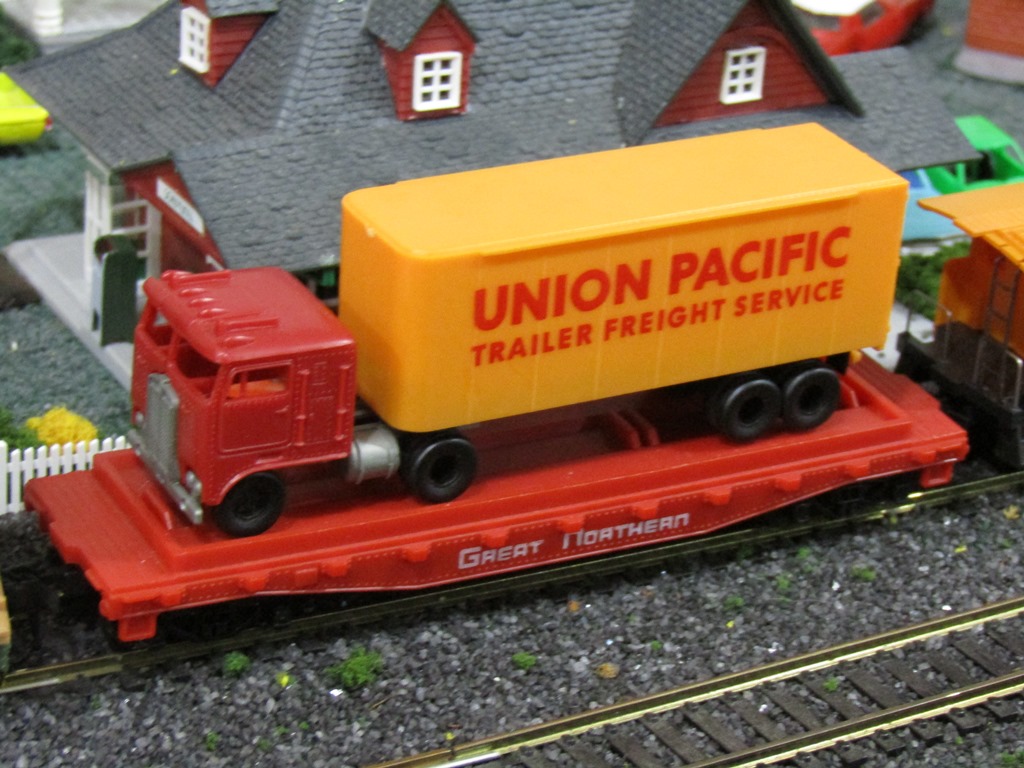 A Red Kenworth truck with a Union Pacific trailer, that I acquired recently on a Great Northern flat car that was missing 3 steps, so I simply switched out that flat car for the only other red GN one I have. This truck-on-a-flatcar looks awesome behind the twin Union Pacific F9's which are currently hauling all of my piggybacks.