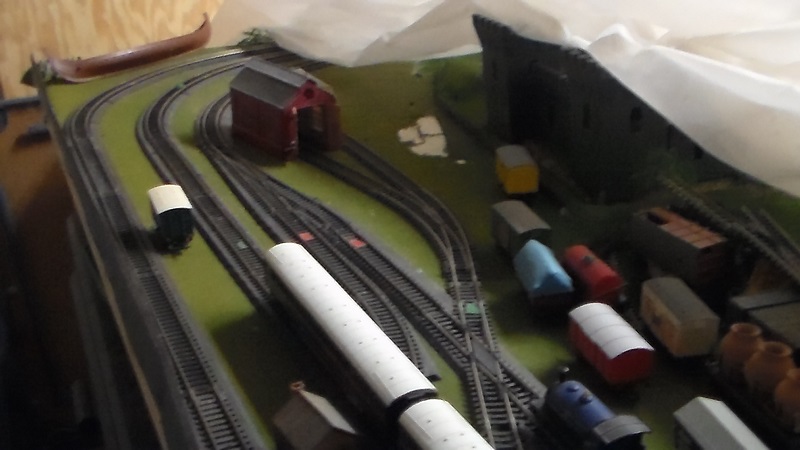 This is the "after" shot, reduced to one Hornby curved turn out, two spurs: a simple stub and the engine shed. Easier on the eyes, easier to operate. The wagons piled up next to it will be stored in a drawer below the layout when not in use.