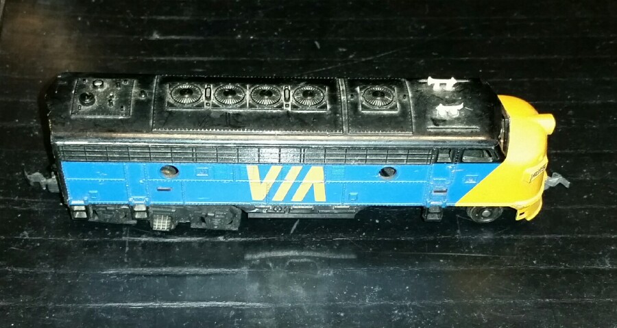 One of the nicer schemes of the SF that I like. My LOTW is a bit further north, from Canada. I found a Tyco Via / CN unit at my local show, the first I've seen. Don't know how rare they are in the USA, but I didnt' have one, so I bought it. I was working on it at my shop today, and unfortunately the zinc pest in the gear studs got it, I tried to pry the gears off, and the stud posts broke off in the gears. Oh well, some of these PT motors suffered from that problem. They don't seem to crack, but the posts swell up, and then it's all over when you try to disassemble it to clean and grease it. I've got spare motor casings, so I can fix it.