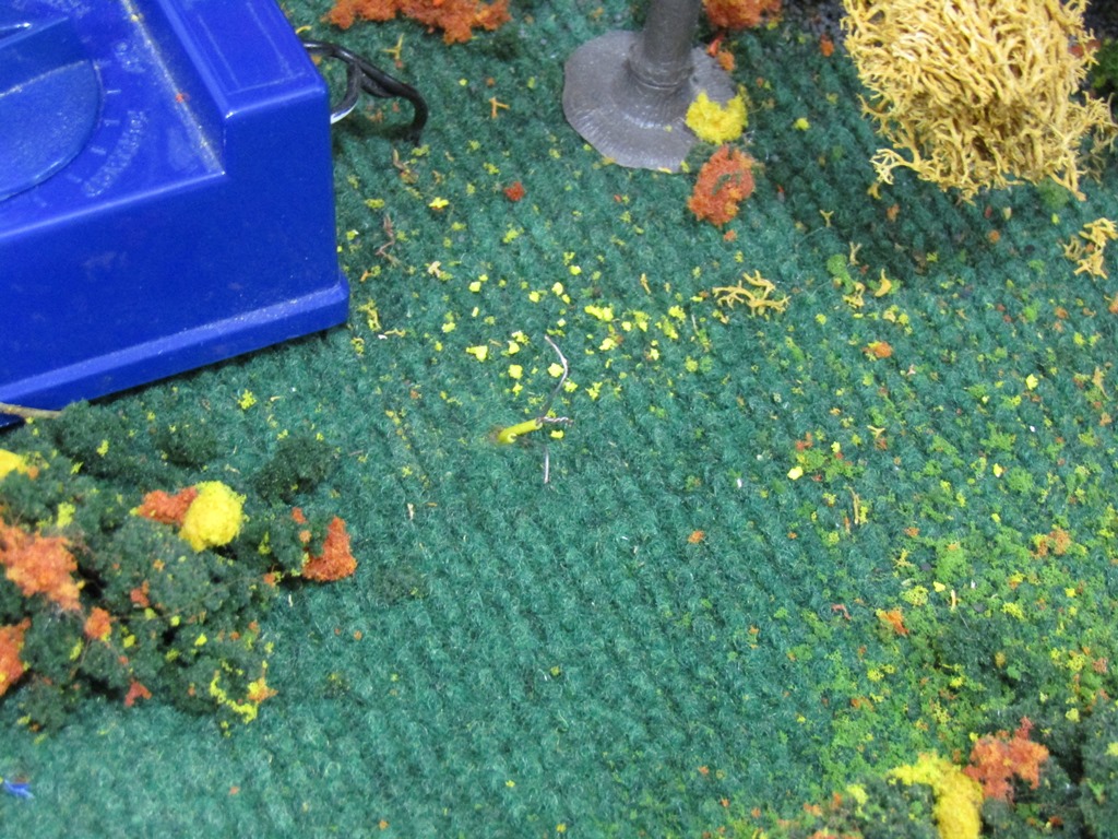 After completing my homework tonight, I amazingly had a bit of time to go down to the layout. So, I utilized that time to remove the faulty blue LL powerpack for the outer line -- I didn't remove the wooden piece on the side of the layout which conceals the wire from view, but instead, just cut the cord with wire snips (the power wasn't on of course.) Within 5 minutes, the old LL powerpack had been removed from the layout, leaving this view of the two wires powering the inner line: