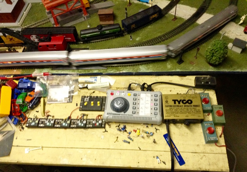 I noticed that my LifeLike 7amp blue power pack controlling the inner line is about to die soon....for it is spasmatically dropping power to the Pennsy Tyco F9A & F9B operating on the inner line. The locomotive slowly shuts down due to a loss of power, and then after a few seconds, it works again. (It's not the F9A, for I tested my Model Power RF-16, and it did the same thing to it.)