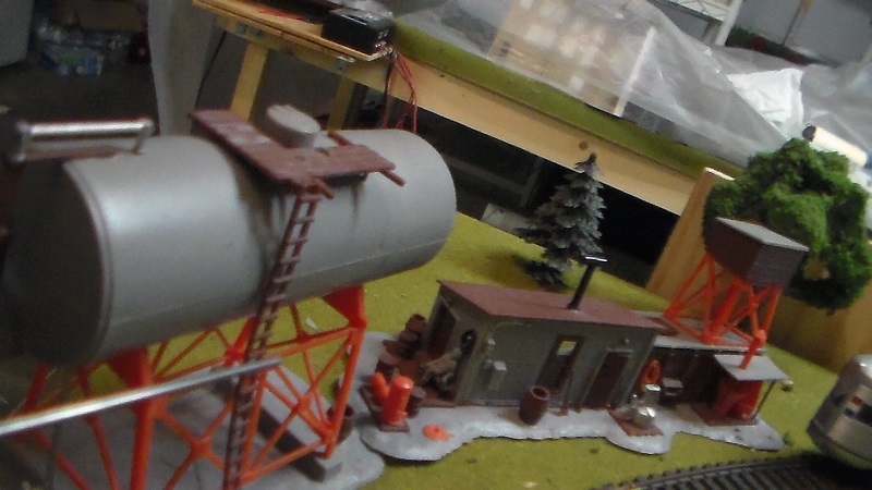 Thanks to the miracle of digital photography, one can take a zillion photos and delete all the out takes. While photographing this nifty fuel and sand depot from the Shark Master, aka RP Model Railroads, I just now noticed the guy sitting on the chair outside the door. Pretty cool! Might try to flesh him out with some paint.