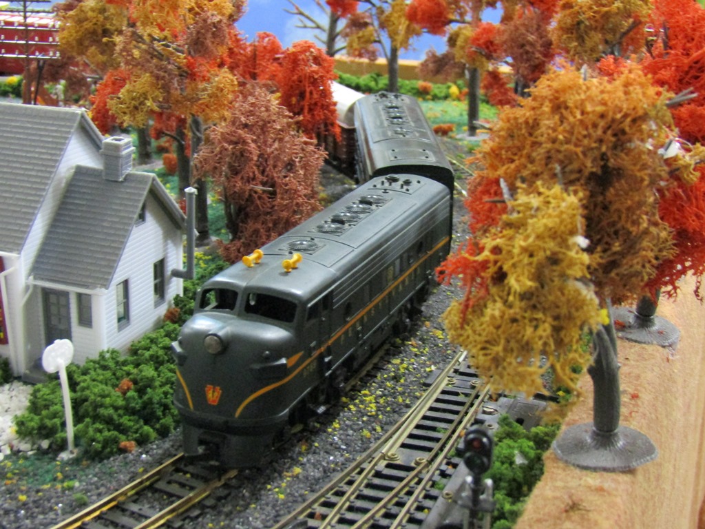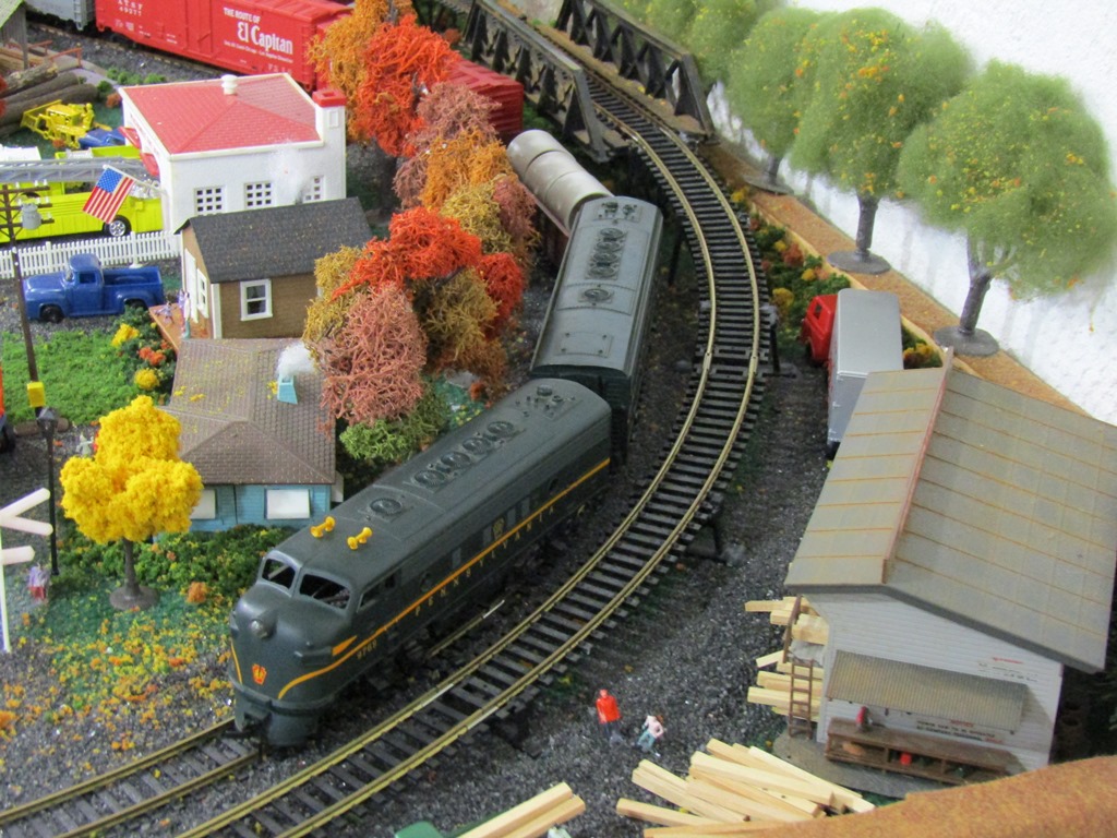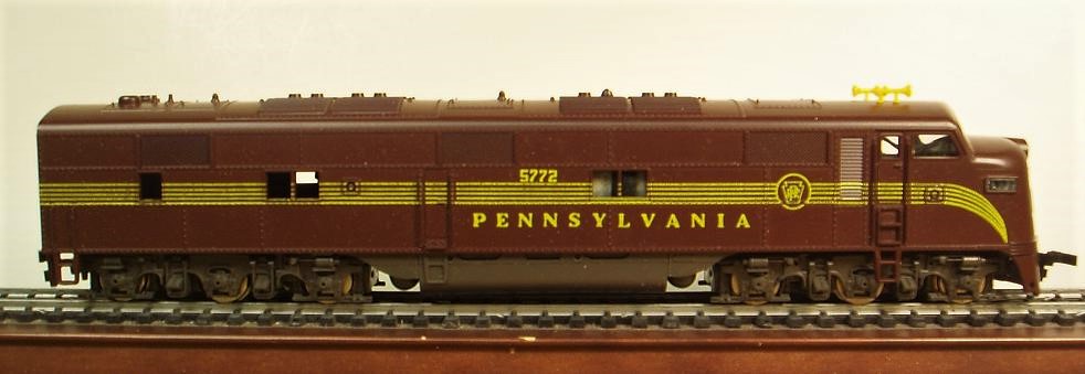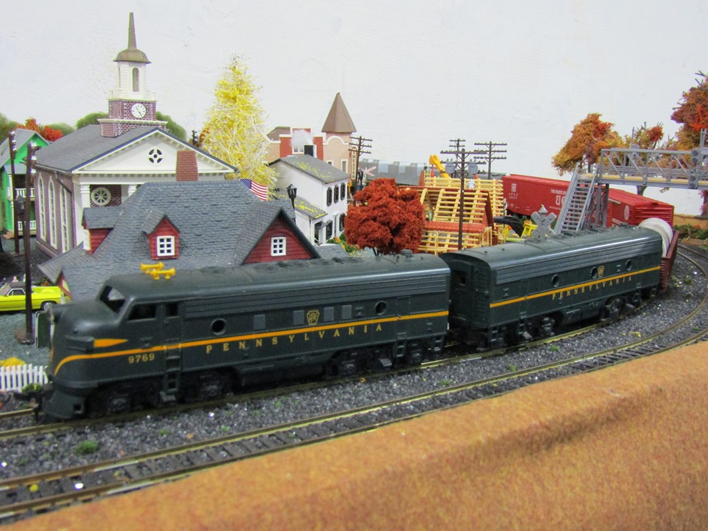 A brilliant A-B pair of vintage 1960's "Red Box" era Tyco Pennsylvania RR F9's, purchased at the Greenberg's Train Show 2 weeks ago -- here they are operating superbly on the Ephrata Valley Railroad, hauling 8 cars in total (although I can clearly tell that's not the ultimate limit, for the A-unit is a strong hauler like most "Red Box" MU-2 Style motors are!) GO PENNSY.