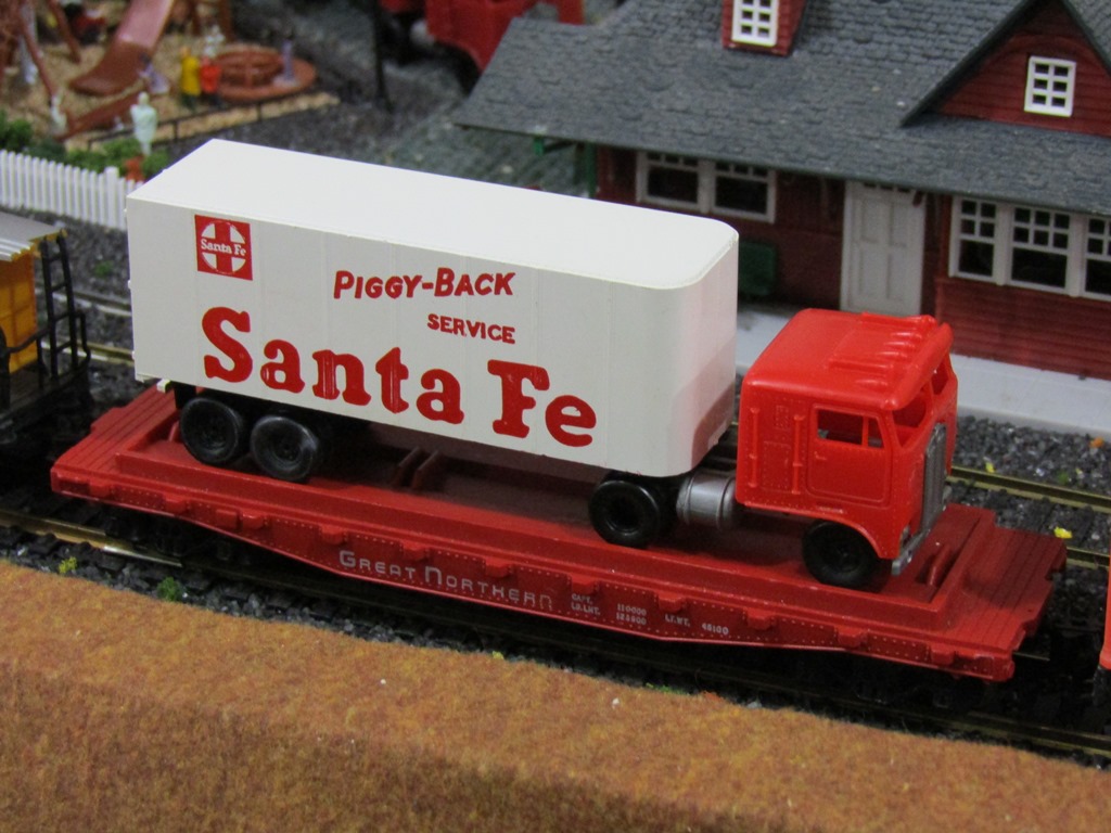 My second tractor-trailer on a flatcar in the roster.....the car is a Great Northern vintage Tyco car with metal bottom (and all broken stepladders), the bright-red cabover Kenworth truck is a find from the train show, while the Santa Fe trailer is from a trade/sale with thesiding (Thanks!!)
