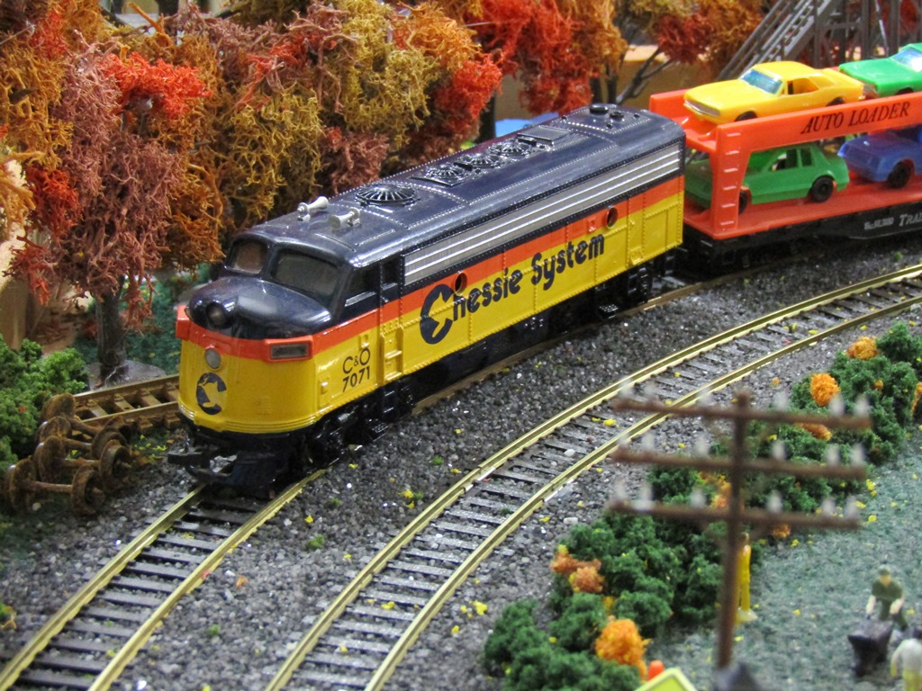 A nice vintage Bachmann Chessie F9A #7071 which has been in my roster since last year, hauling all 4 of my Autoloaders as well as the Kenworth cabover w. Santa Fe trailer on-a-flatcar.