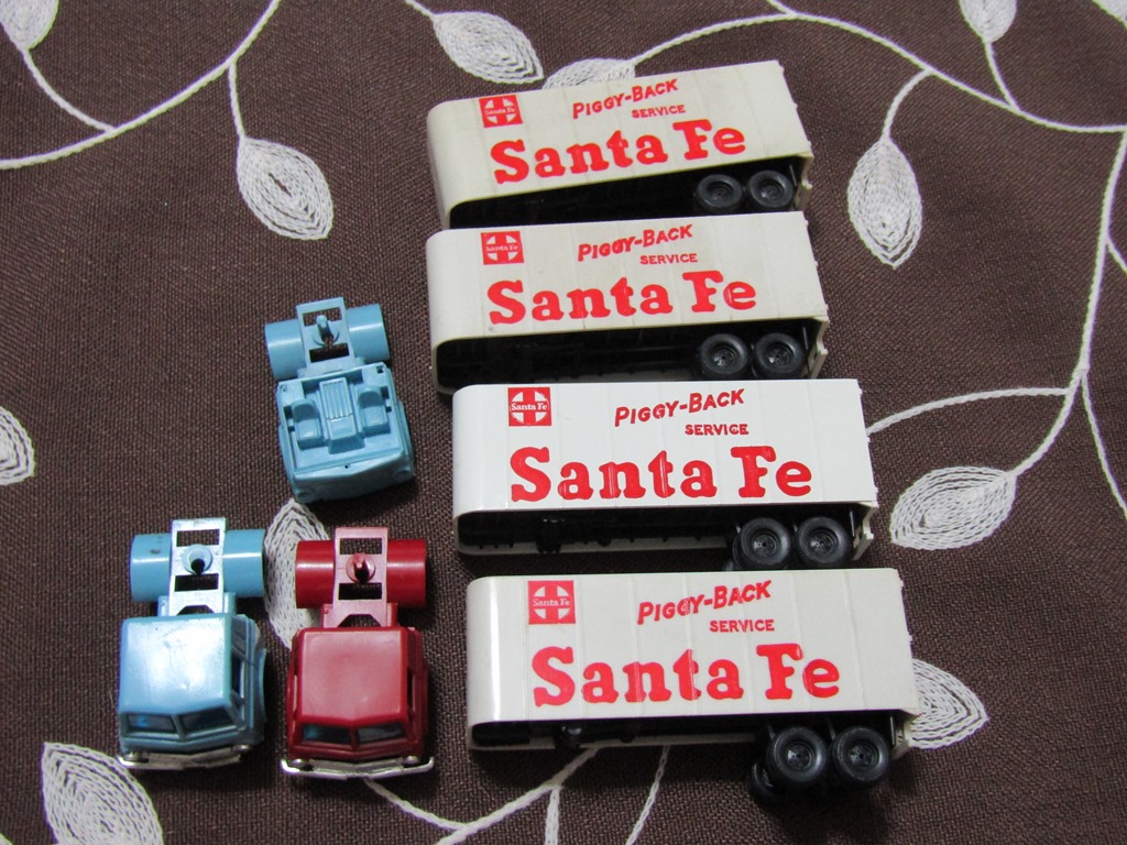 Two Tyco Dodge cabovers, a blue Dodge chassis, and 4 ATSF piggyback trailers, all part of a trade/sale with thesiding!! Thanks again for a great transaction.