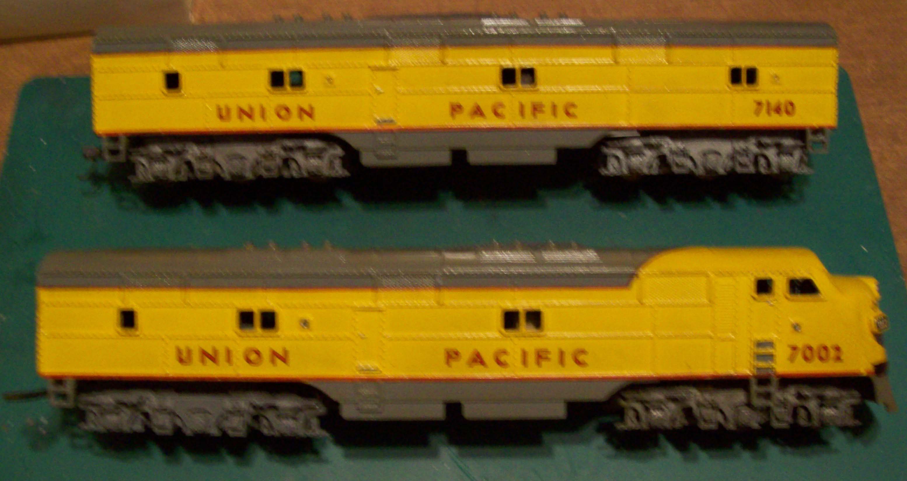 Gonna start this week with a loco that I've been working on for a LONG time. Its a Hobbytown EMC7 A&B unit. The body, frame and truck are by Hobbytown but the power is by Athearn. Wasn't geting very good performance out of the DC91's that came with them so I decided to try to mount some Athearn motors. And the performance is really outstanding.
